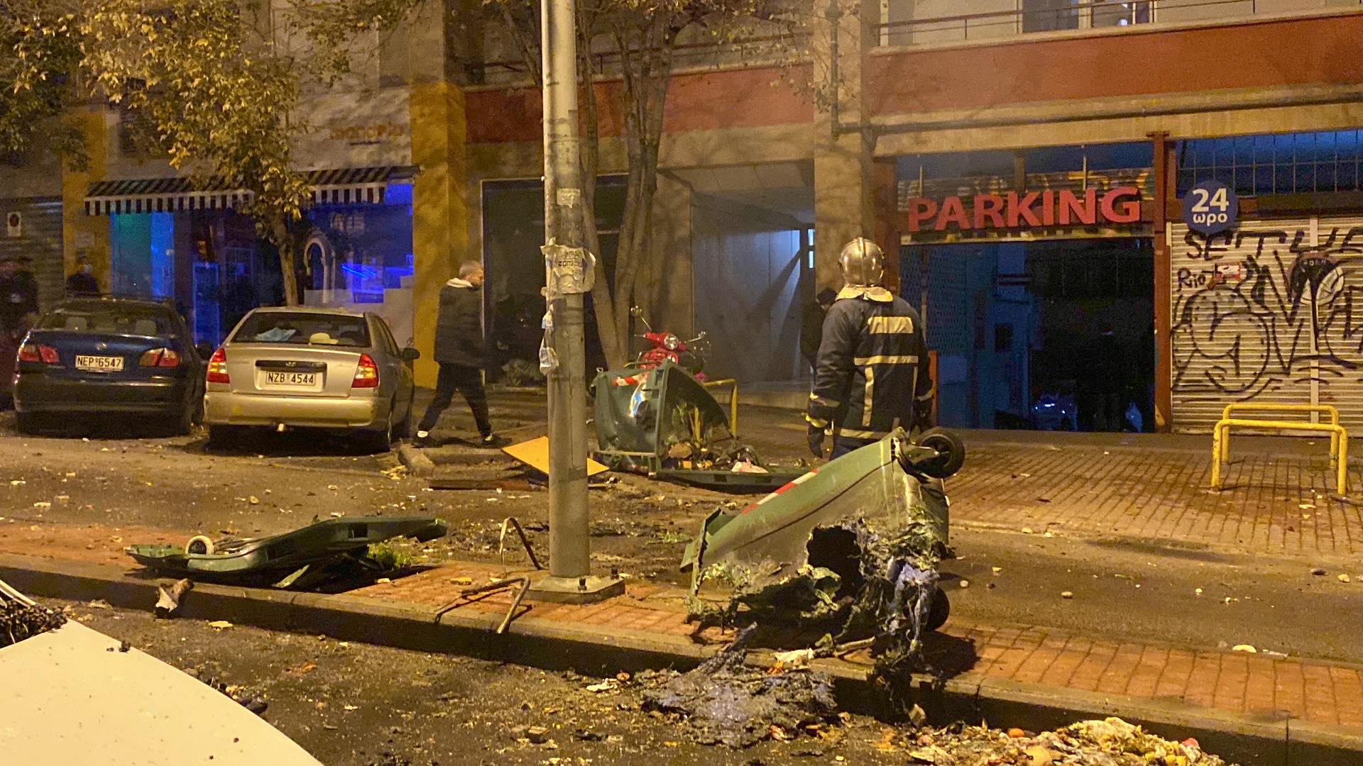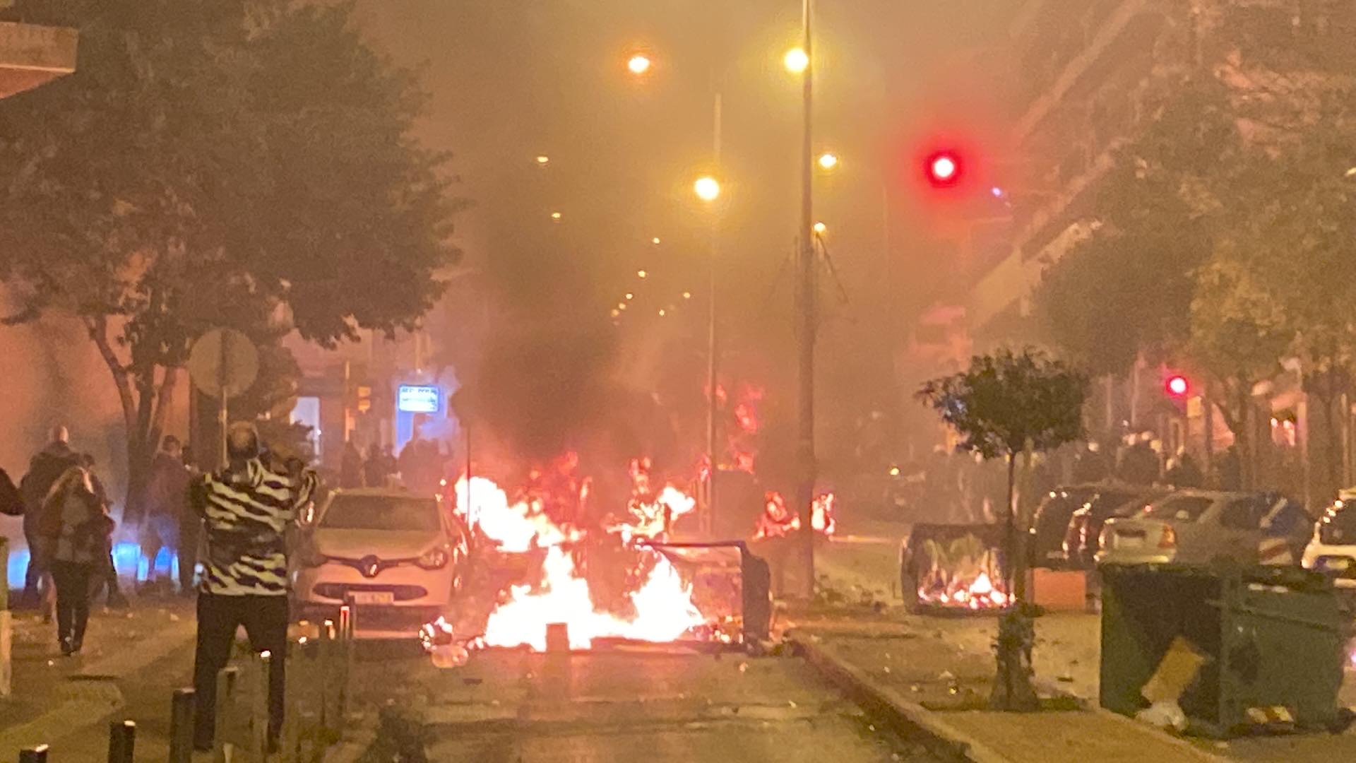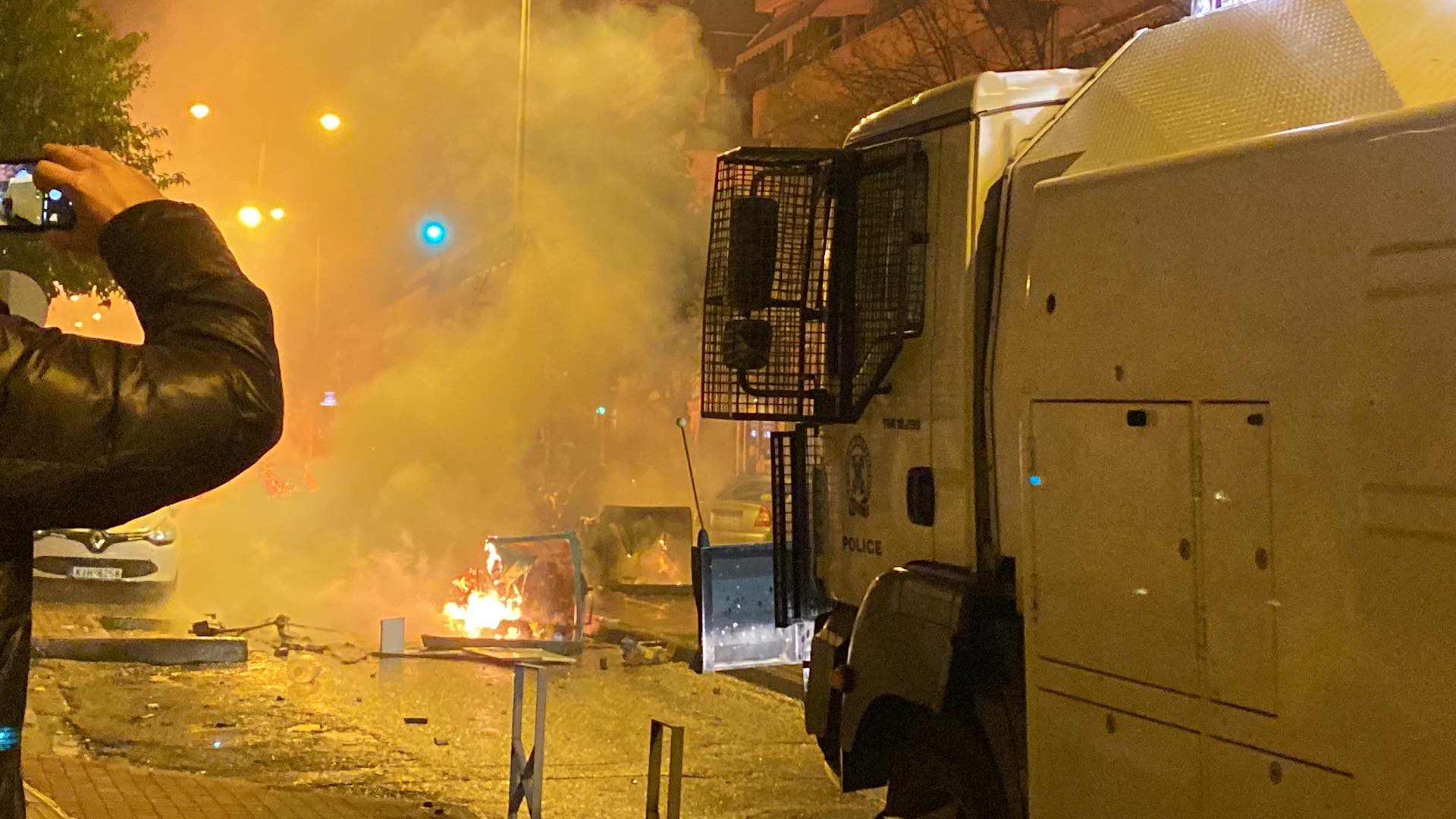 Η περιοχή θυμίζει πεδίο μάχης, με ομάδα ατόμων με καλυμμένα τα χαρακτηριστικά των προσώπων τους, να επιτέθηκαν σε αστυνομικές δυνάμεις στο τουρκικό προξενείο, στην οδό Αγίου Δημητρίου.