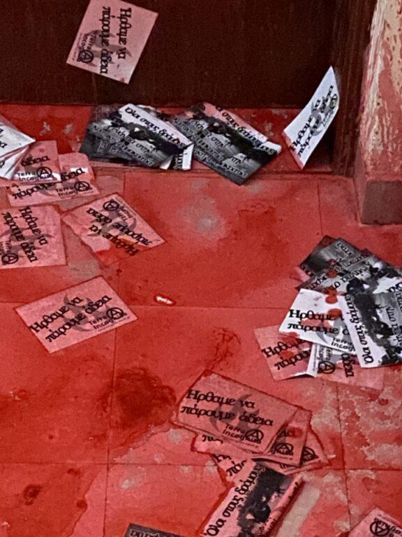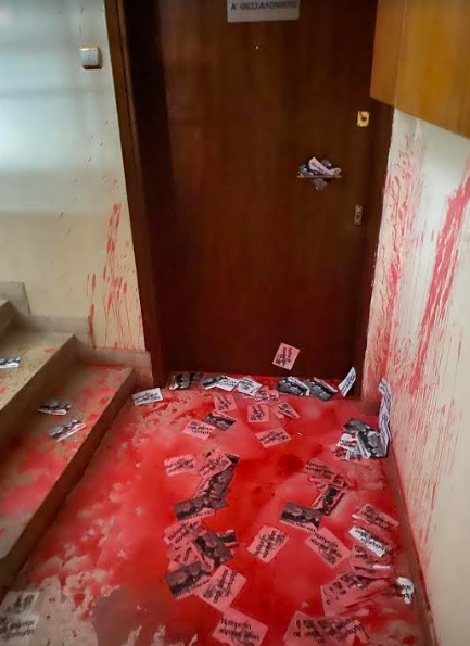 Το περιστατικό σημειώθηκε σήμερα το πρωί όταν άγνωστα άτομα πέταξαν έξω από το γραφείο, μπογιές και τρικάκια.