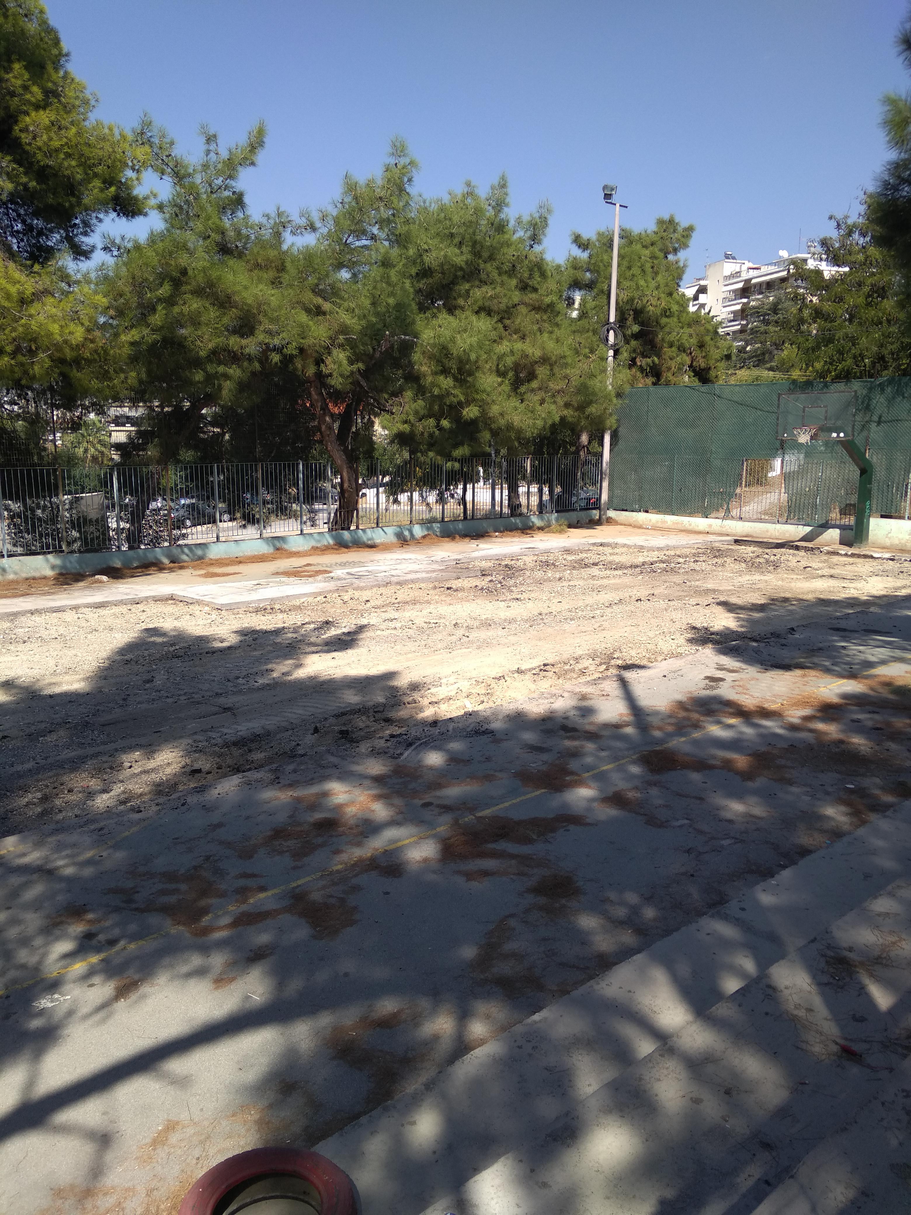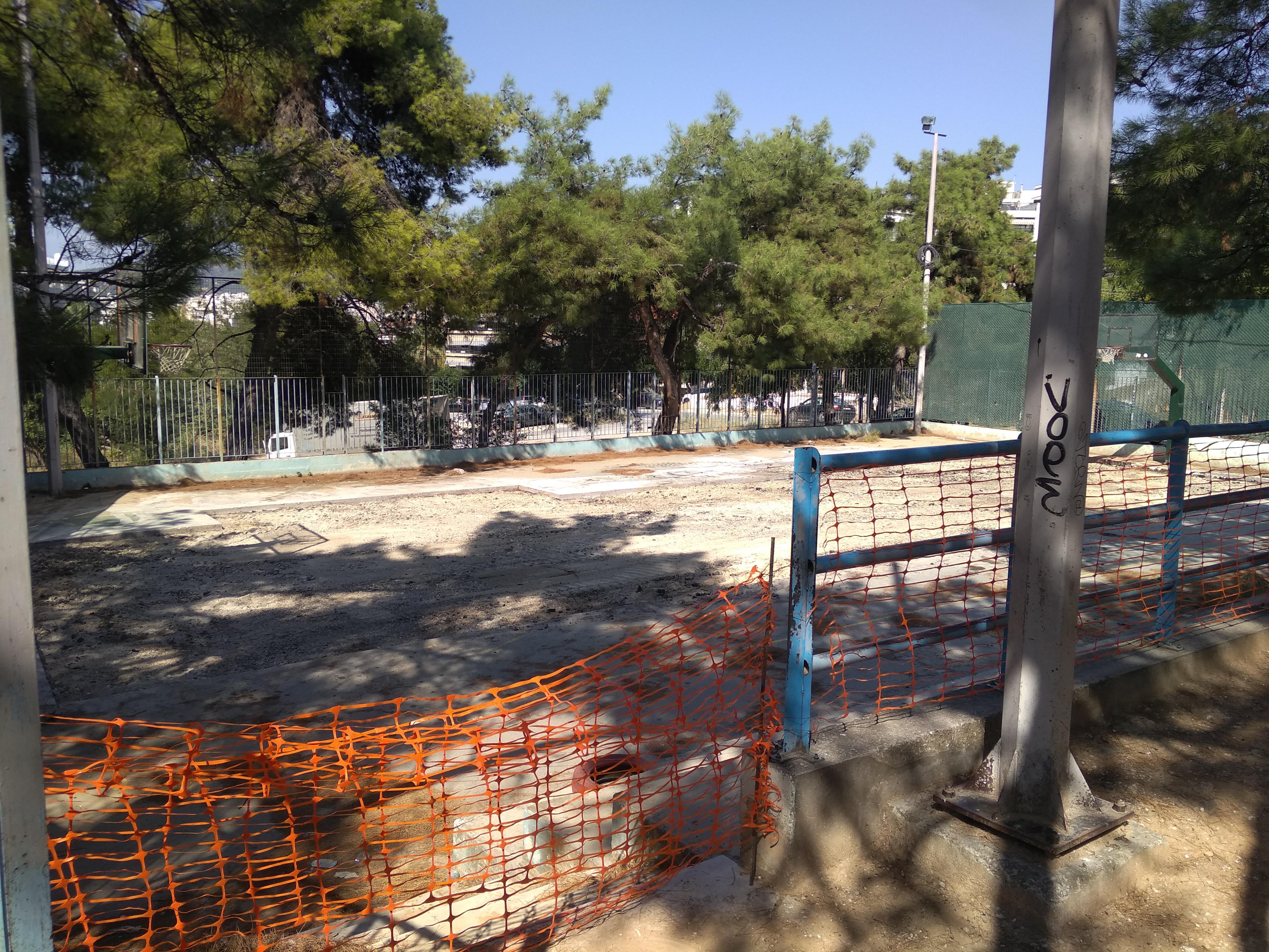Οι εργασίες έχουν σταματήσει. Την Κυριακή έφυγαν οι μπουλντόζες. Δεν έκαναν σχεδόν τίποτα. Μέχρι το Σάββατο τα φορτηγά γέμιζαν με τσιμέντο και χώμα από το σημείο που έσκαψαν. Τα έχουν αφήσει στη μέση. Υπάρχουν κάποιες κερκίδες που έχουν ένα κάγκελο προστατευτικό στην πλάτη μας όπως καθόμαστε, το οποίο είναι διαχωριστικό κατά κάποιο τρόπο με την υπόλοιπη αυλή και το χώμα με δέντρα. Το μοναδικό μέσο προστασίας αυτή τη στιγμή είναι ένα δίχτυ, που το ύψος του σε έναν ενήλικα άνθρωπο φτάνει περίπου στη μέση και είναι πολύ επικίνδυνο, γιατί ακόμη και χωρίς αυτό τα παιδάκια σκαρφάλωναν και όλοι την ώρα οι δάσκαλοι έπρεπε να τους επιτηρούν και να τους κάνουν παρατήρηση. Φανταστείτε πώς είναι τώρα η κατάσταση».