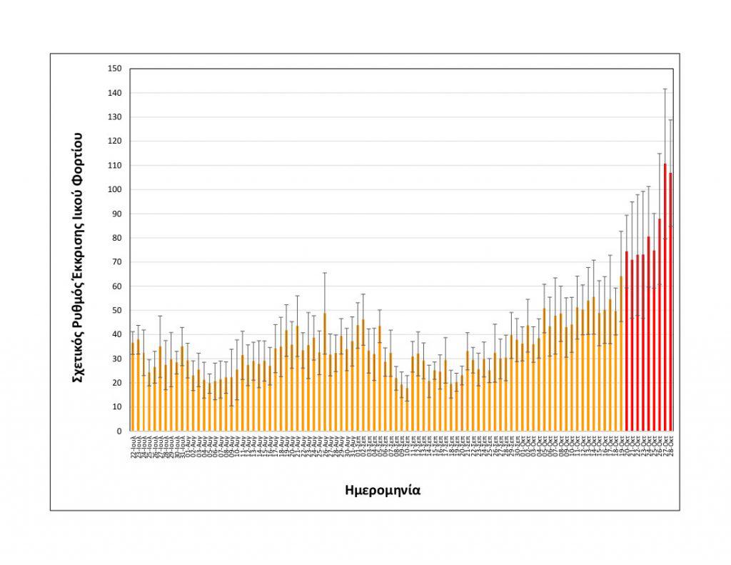 Συγκεκριμένα στα δείγματα που λαμβάνονται καθημερινά στην είσοδο της Εγκατάστασης Επεξεργασίας Λυμάτων Θεσσαλονίκης, αναφορικά με τις εξορθολογισμένες τιμές σχετικής έκκρισης ιικού φορτίου, η μέση τιμή των δύο πιο πρόσφατων μετρήσεων, δηλαδή της Τετάρτης 27/10 και της Πέμπτης 28/10 είναι: