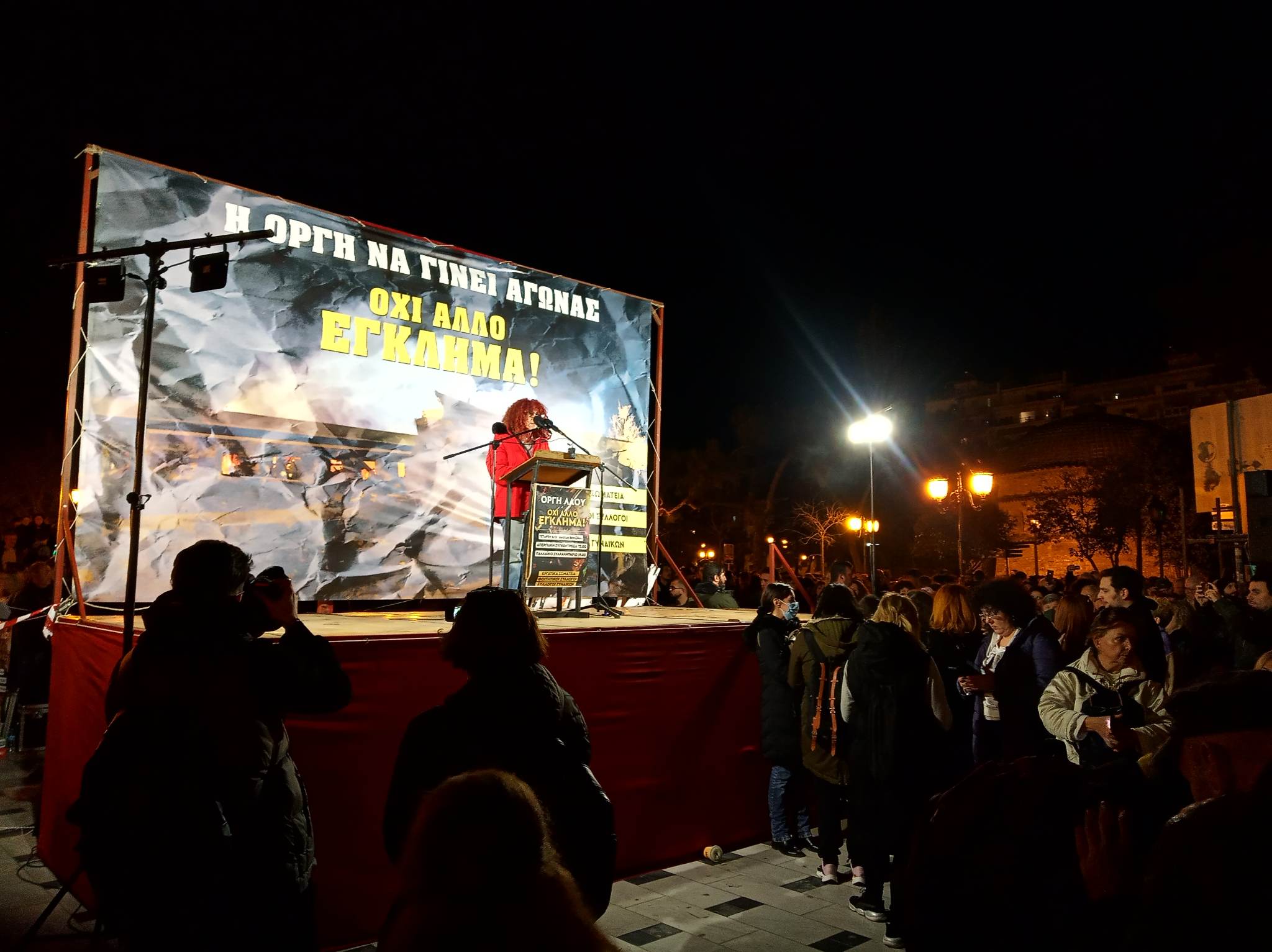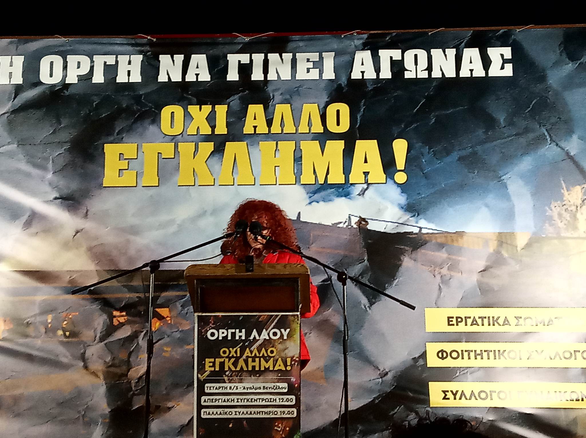 «Η οργή να γίνει αγώνας, όχι άλλο έγκλημα!» αναγράφεται στην κεντρική εξέδρα που έχουν στήσει οι διοργανωτές.