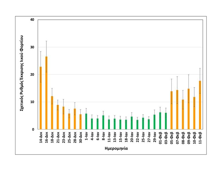 Συγκεκριμένα, η μέση τιμή των μετρήσεων της Τετάρτης 10/2 και της Πέμπτης 11/2 είναι αυξημένη κατά περίπου 15% σε σύγκριση με τη μέση τιμή της Δευτέρας 8/2 και Τρίτης 9/2 και όπως φαίνεται στο διάγραμμα που παρουσιάζει το ΑΠΕ-ΜΠΕ το ιικό φορτίο είναι στα επίπεδα που βρισκόταν μεταξύ 26 και 28 Οκτωβρίου, πριν τη μεγάλη επιδημιολογική έξαρση.