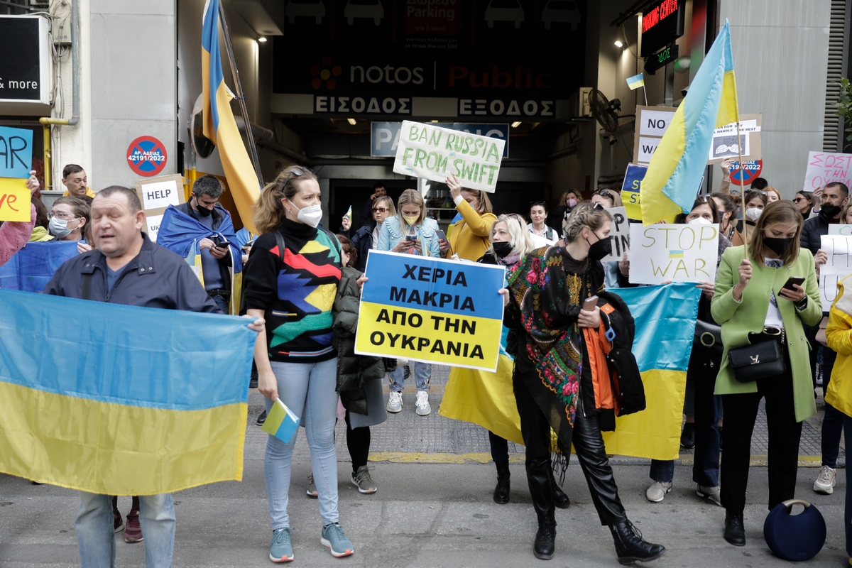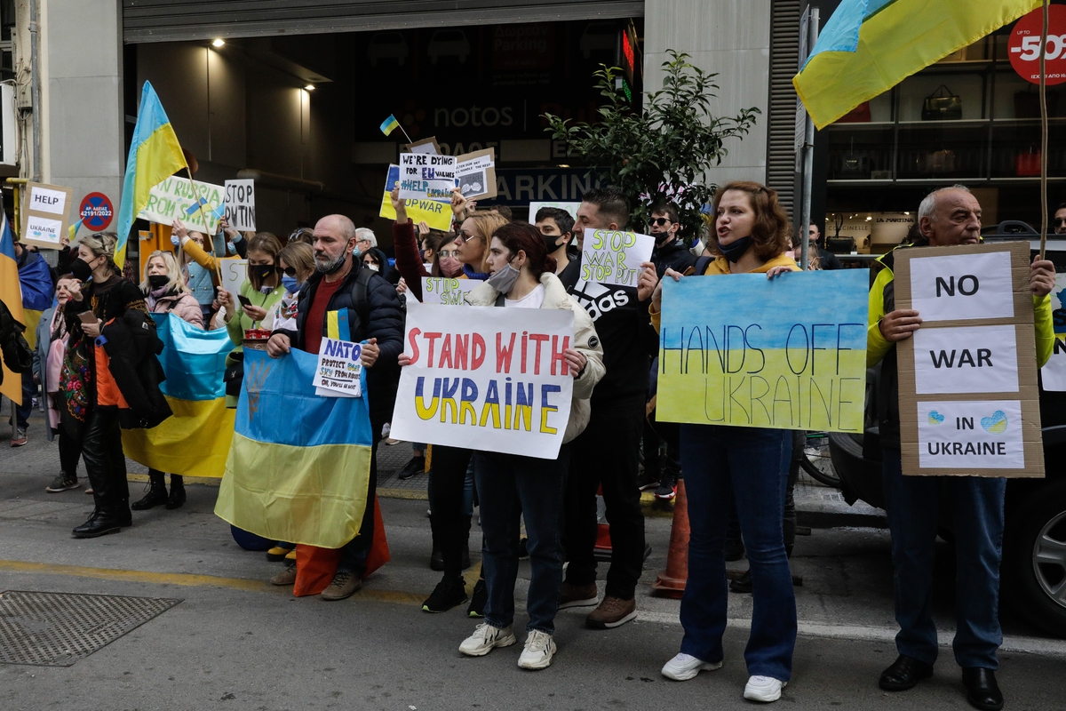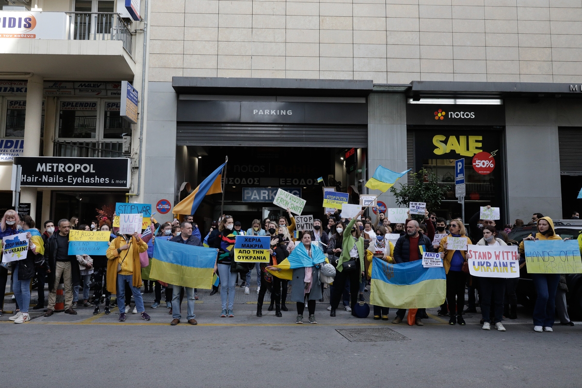 Οι Ουκρανοί, οι οποίοι με πανό και πλακάτ κατήγγειλαν την εισβολή της Ρωσίας στην Ουκρανία, συγκεντρώθηκαν στην παλιά παραλία στο ύψος της πλατείας Αριστοτέλους, έκαναν πορεία ως τη νέα παραλία και το γλυπτό “Ομπρέλες” του Ζογγολοπουλου και επέστρεψαν στην οδό Μητροπόλεως, στο ύψος της Αριστοτέλους παραμένοντας μπροστά στην κλούβα των ΜΑΤ που έκλεινε το δρόμο προς το προξενείο της Ρωσίας στη Θεσσαλονίκη.
