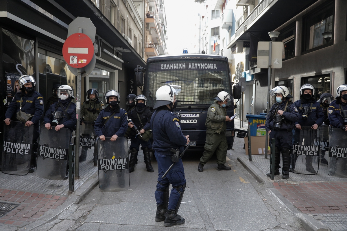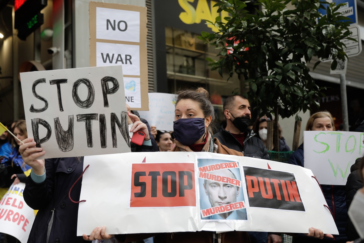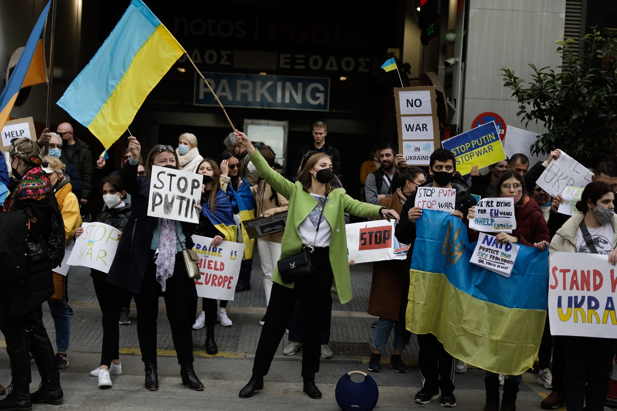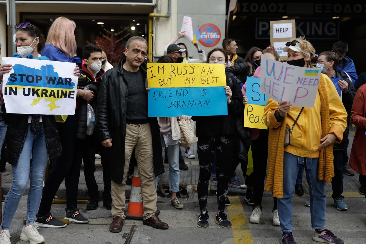 Οι Ουκρανοί, οι οποίοι με πανό και πλακάτ κατήγγειλαν την εισβολή της Ρωσίας στην Ουκρανία, συγκεντρώθηκαν στην παλιά παραλία στο ύψος της πλατείας Αριστοτέλους, έκαναν πορεία ως τη νέα παραλία και το γλυπτό “Ομπρέλες” του Ζογγολοπουλου και επέστρεψαν στην οδό Μητροπόλεως, στο ύψος της Αριστοτέλους παραμένοντας μπροστά στην κλούβα των ΜΑΤ που έκλεινε το δρόμο προς το προξενείο της Ρωσίας στη Θεσσαλονίκη.