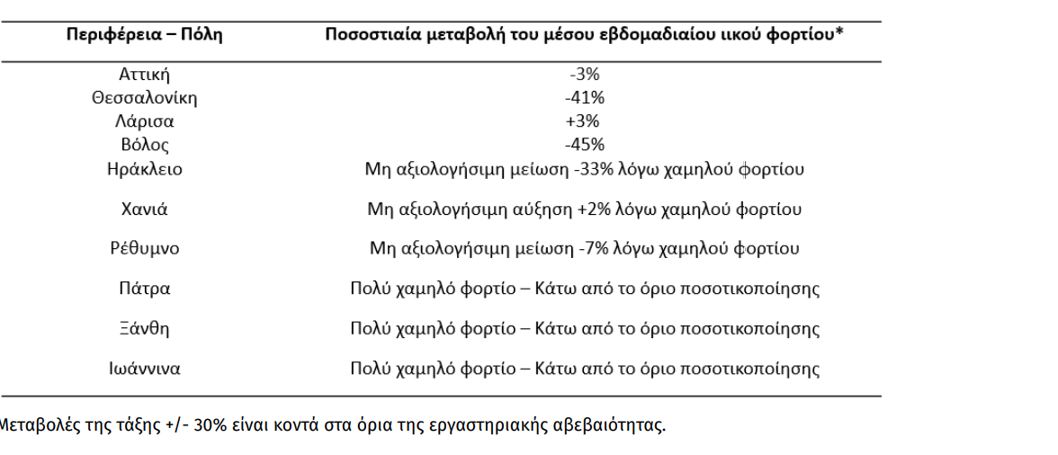 Πίνακας 1: Ποσοστιαία μεταβολή στη μέση συγκέντρωση του ιικού φορτίου του SARS-CoV-2 στα αστικά λύματα ανά 100.000 κατοίκους την περίοδο 21-27 Ιουνίου 2021 σε σχέση με την εβδομάδα 14-20 Ιουνίου 2021.