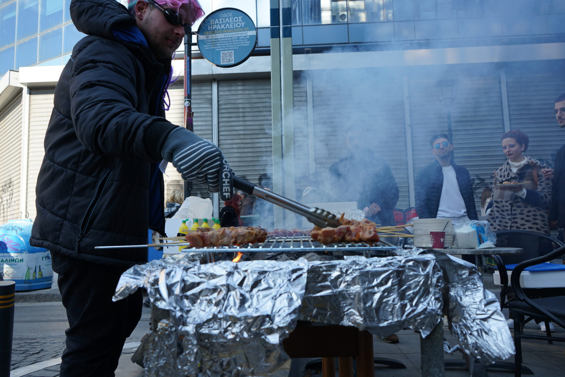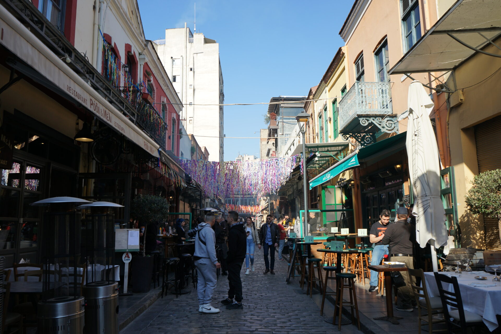 Μια τεράστια σειρά ψησταριές στη Βασιλέως Ηρακλείου και έξω από όλα τα καταστήματα στα Λαδάδικα, στη Βαλαωρίτου, στα στενά της Εγνατίας, ποτά σε χάρτινα ποτήρια, σερπαντίνες και κομφετί και τραγούδια, αποκριάτικα, λαϊκά, αλλά και ραπ συνθέτουν το αποκριάτικο σκηνικό, που αναμένεται να λήξει με το πρώτο φως της αυριανής ημέρας.