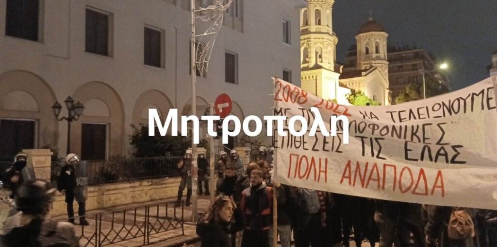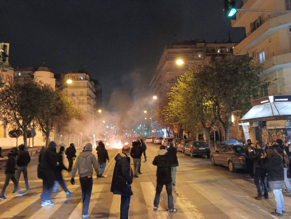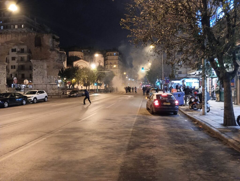 Αντιεξουσιαστές που είχαν συγκεντρωθεί στην πλατεία Καμάρας λίγο νωρίτερα για τον 16χρονο που δέχτηκε πυροβολισμό από αστυνομικό εκτόξευσαν βόμβες μολότοφ στις δυνάμεις των ΜΑΤ, με τις δυνάμεις της Αστυνομίας να απάντησαν με χρήση χημικών και κρότου λάμψης.