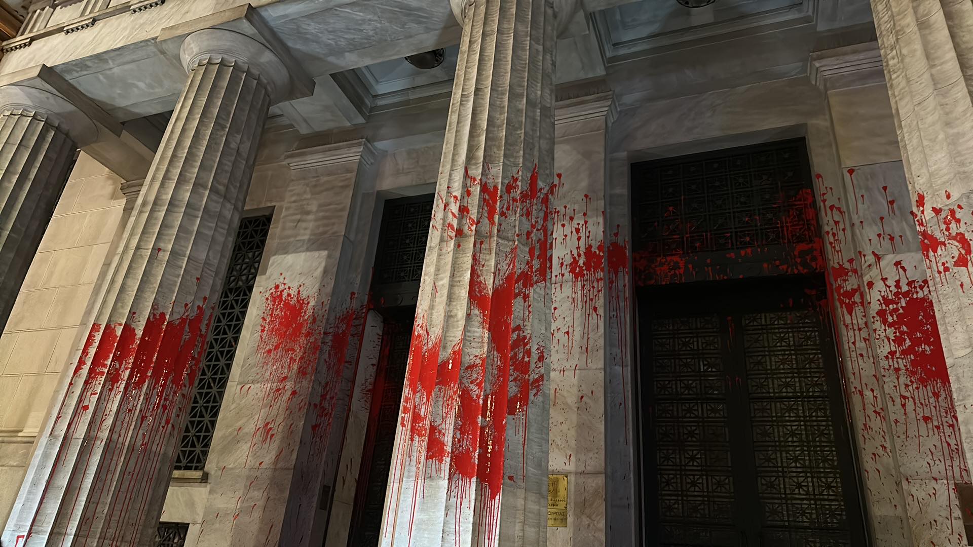 Παράλληλα, πέταξαν μπογιές με κόκκινο χρώμα στο κτίριο της Τράπεζας της Ελλάδος που βρίσκεται στην οδό Τσιμισκή.