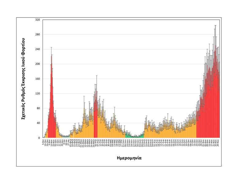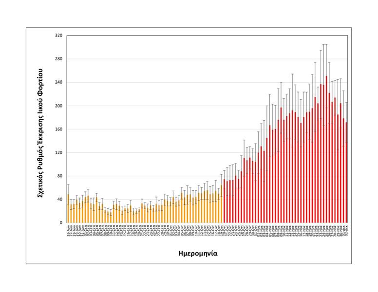 Όπως φαίνεται στα διαγράμματα που παρουσιάζει το ΑΠΕ-ΜΠΕ την αρχική τάση σταθεροποίησης που καταγράφηκε από τις 26 Νοεμβρίου ακολουθούν τις πρώτες μέρες του Δεκεμβρίου οι πρώτες ενδείξεις αποκλιμάκωσης των τιμών του ιικού φορτίου.