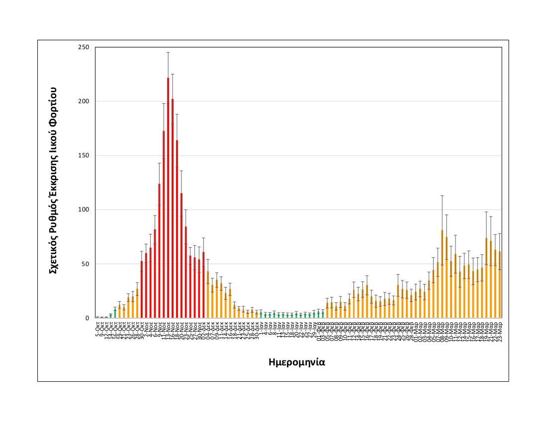 Στα συνημμένα διαγράμματα του ΑΠΘ, οι ημέρες των δειγματοληψιών που καταγράφονται με πορτοκαλί χρώμα αντιστοιχούν σε 100-400 κρούσματα (όπως ανακοινώθηκαν τις αντίστοιχες ημέρες από τον ΕΟΔΥ) και οι μέρες που καταγράφονται με πράσινο, σε λιγότερα από εκατό ανακοινωμένα επιβεβαιωμένα κρούσματα.