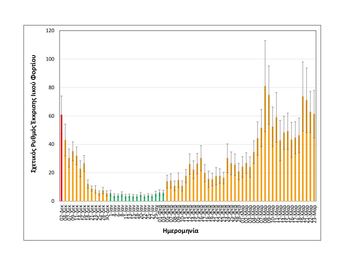 -Μειωμένη κατά 14% σε σχέση με τη μέση τιμή των δύο αμέσως, προηγούμενων μετρήσεων, δηλαδή της Παρασκευής 19/3 και της Κυριακής 21/3.