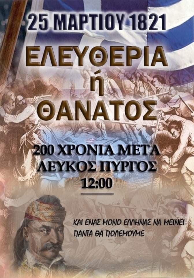 Μία από αυτές τιτλοφορείται ως «25 Μαρτίου 1821 ΕΛΕΥΘΕΡΙΑ Ή ΘΑΝΑΤΟΣ 200 ΧΡΟΝΙΑ ΜΕΤΑ» με το ραντεβού να δίνεται για την 25η Μαρτίου στις 12:00 στον Λευκό Πύργο.