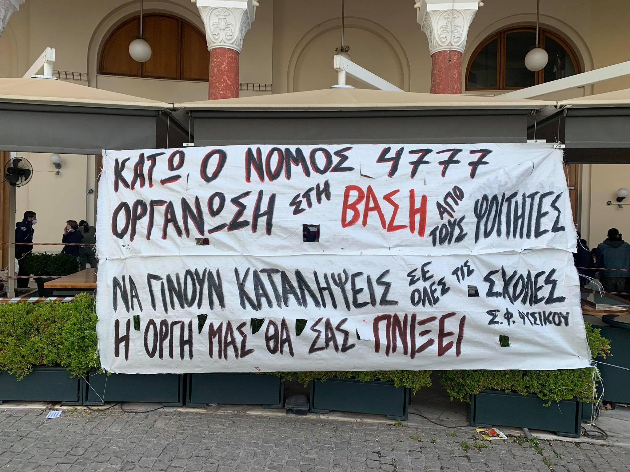 Οι καταληψίες προχώρησαν και σε ανάρτηση πανό στην πρόσοψη του κτιρίου που γράφει: