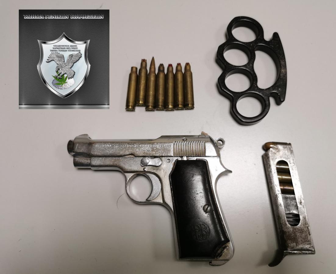 2 δέματα κάνναβης συνολικού βάρους 134,2 γραμμαρίων 1 δέμα κοκαΐνης βάρους 14 γραμμαρίων 1 πιστόλι, φυσίγγια και κάλυκες 1 σιδερογροθιά 1 ηλεκτρονική ζυγαριά ακριβείας 4 κινητά τηλέφωνα που χρησιμοποιούσε για τις παράνομες συναλλαγές του και Χρηματικό ποσό προερχόμενο από εμπορία ναρκωτικών.