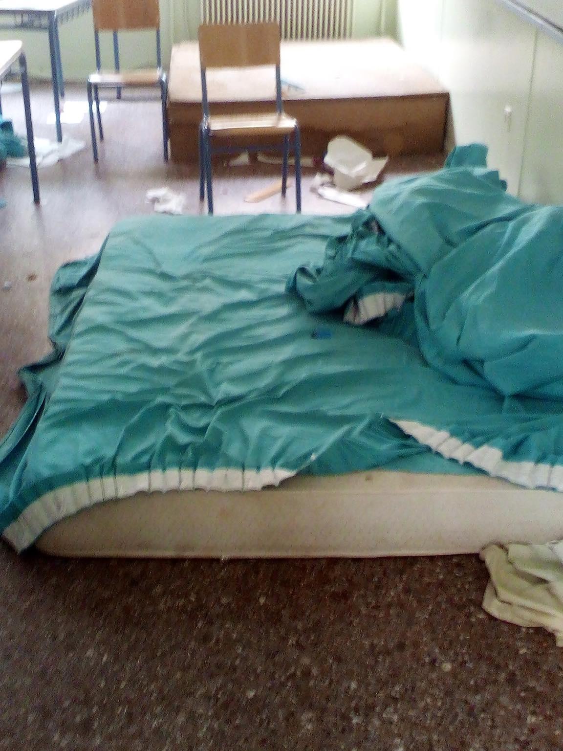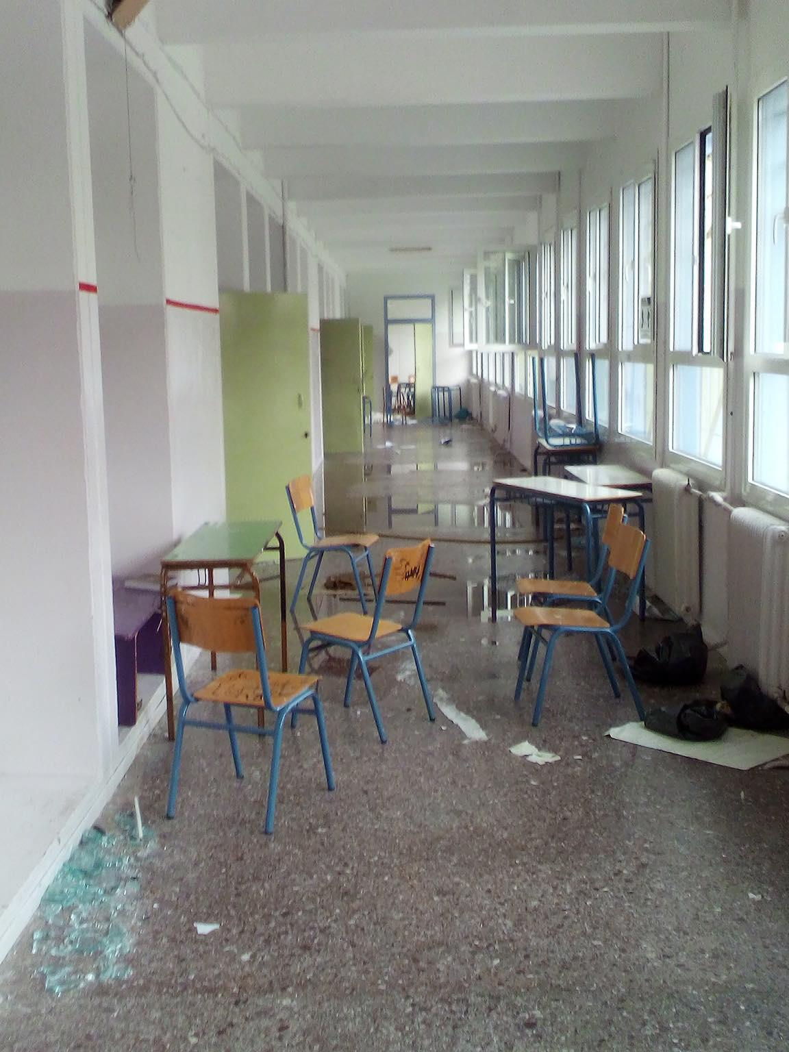 Ο διευθυντής βρήκε σπασμένες πόρτες, τουαλέτες, τζάμια ενώ στο χώρο υπήρχαν στρώματα τα οποία είχαν βρει στα σκουπίδια οι εξωσχολικοί και είχαν πάρει και τις κουρτίνες για να σκεπαστούν.