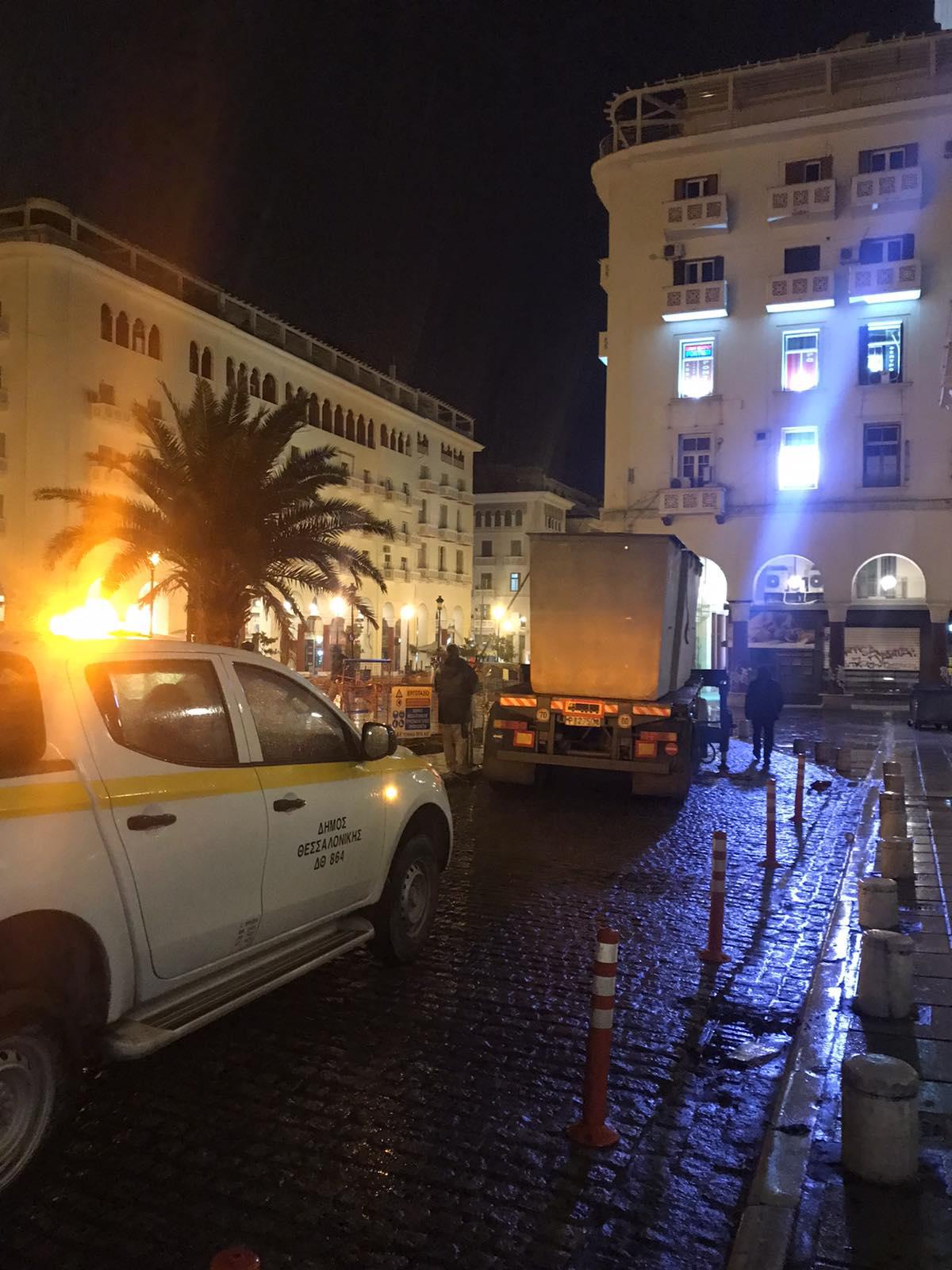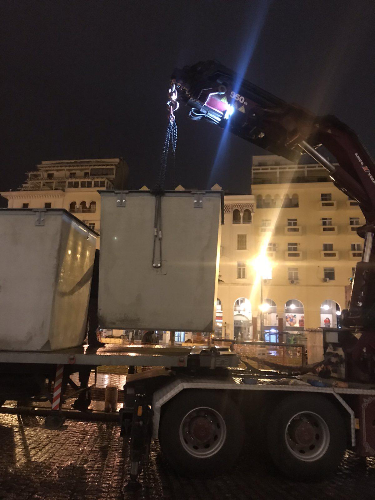 Οι πρώτοι κάδοι μεταφέρθηκαν από τον δήμο Θεσσαλονίκης τις νυχτερινές ώρες, για να μην υπάρξει κυκλοφοριακό πρόβλημα, στο κομμάτι της πλατείας Αριστοτέλους κάτω από την οδό Εγνατία.