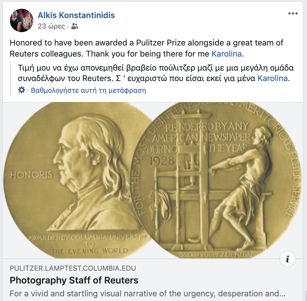 Ο Θεσσαλονικιός φωτογράφος Άλκης Κωνσταντινίδης φωτογράφο διακρίθηκε μαζί με την ομάδα του Reuters για την φωτογραφική κάλυψη της προσφυγικής κρίσης στα σύνορα των ΗΠΑ με το Μεξικό. O Άλκης Κωνσταντινίδης έγραψε στον λογαριασμό του στο Facebook ότι ήταν τιμή του να βραβευθεί με το Πούλιτζερ μαζί με τους συναδέλφους του από το Reuters. Είναι η δεύτερη φορά σε 2 χρόνια.