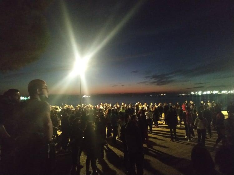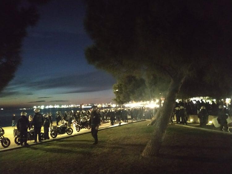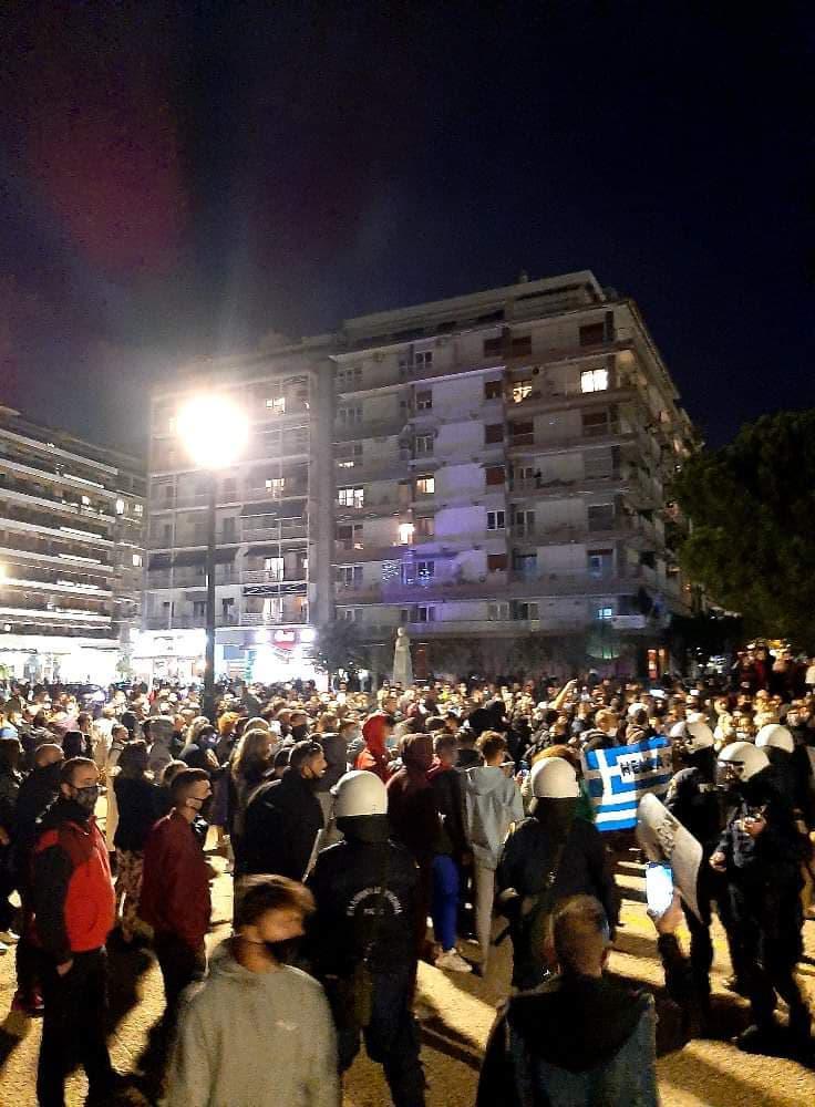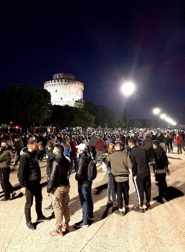 Σε εξέλιξη βρίσκεται αυτήν την ώρα συγκέντρωση περίπου 300 ατόμων κάτω από τον Λευκό Πύργο. Οι διαδηλωτές τραγουδάνε τον εθνικό ύμνο και φωνάζουν συνθήματα όπως “Ελλάς Ελλάς ή ταν ‘η επί τας” υπό την παρουσία ισχυρών αστυνομικών δυνάμεων οι οποίες δεν επιτρέπουν στους περαστικούς να πλησιάσουν. Μερικοί φοράνε μάσκες αλλά σε καμία περίπτωση δεν τηρούν τις αποστάσεις ασφαλείας. Κάποιοι κρατούν ελληνικές σημαίες ενώ μικροένταση σημειώθηκε μεταξύ των αστυνομικών και κάποιων από τους διαδηλωτές που διαμαρτύρονται για το lockdown.