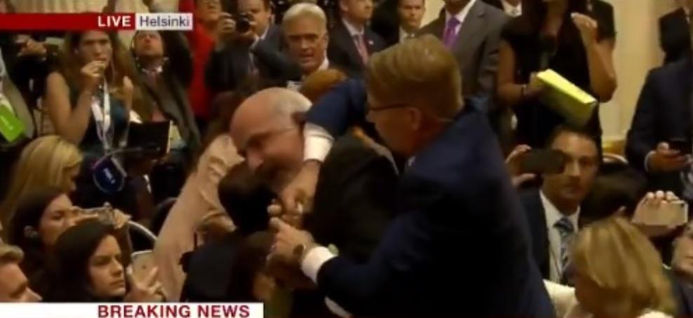Άνδρες των υπηρεσιών ασφαλείας απομάκρυναν έναν διαδηλωτή από την αίθουσα όπου επρόκειτο να δώσουν κοινή συνέντευξη Τύπου οι ηγέτες της Ρωσίας και των ΗΠΑ.