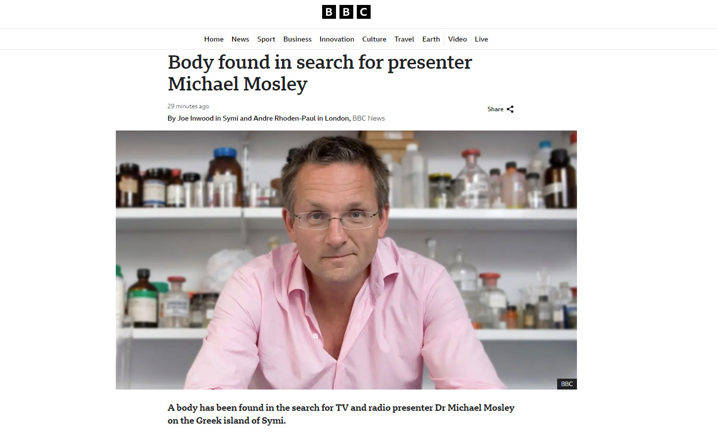 «Βρέθηκε πτώμα κατά την αναζήτηση του παρουσιαστή Μάικλ Μόσλεϊ», είναι ο τίτλος του δημοσιεύματος του BBC, στο δυναμικό του οποίου ανήκε ο παρουσιαστής. «Το πτώμα – το οποίο δεν έχει ακόμη ταυτοποιηθεί επισήμως – βρέθηκε σε βραχώδη περιοχή στο ελληνικό νησί Σύμη», αναφέρεται.