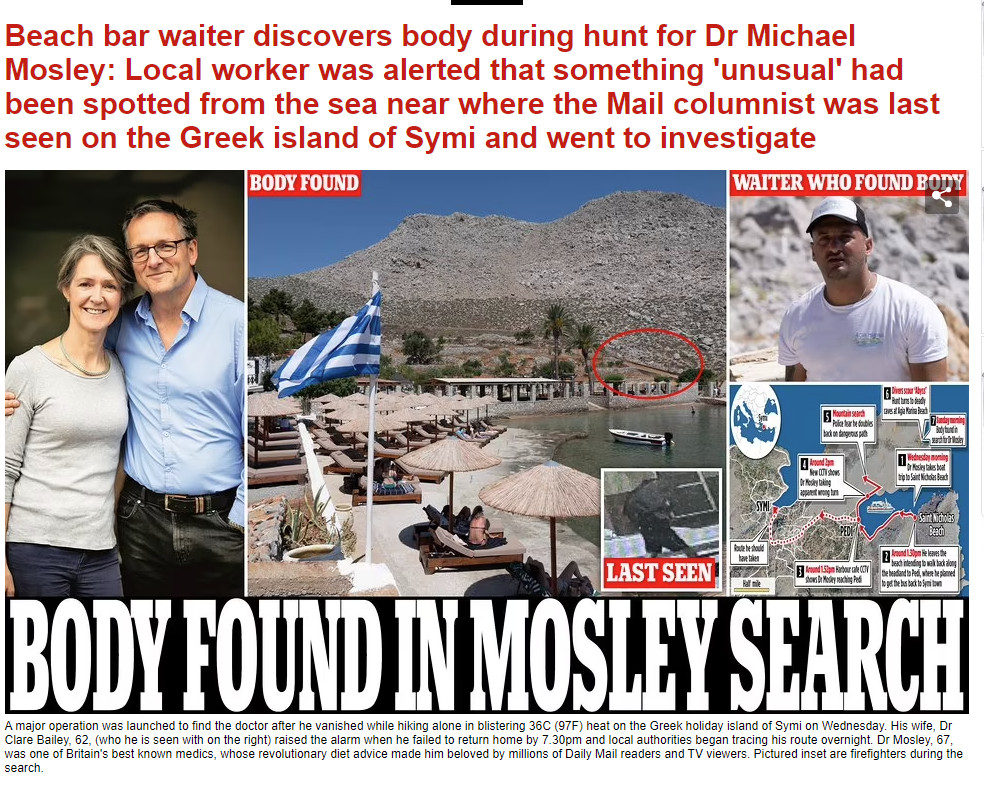«Το πτώμα του τηλεοπτικού γιατρού Μάικλ Μόσλεϊ βρέθηκε κατά τη διάρκεια έρευνας στη Σύμη, λέει Έλληνας αξιωματούχος», είναι ο τίτλος του δημοσιεύματος του Independent με όλες τις εξελίξεις για τον εντοπισμό της σορού.