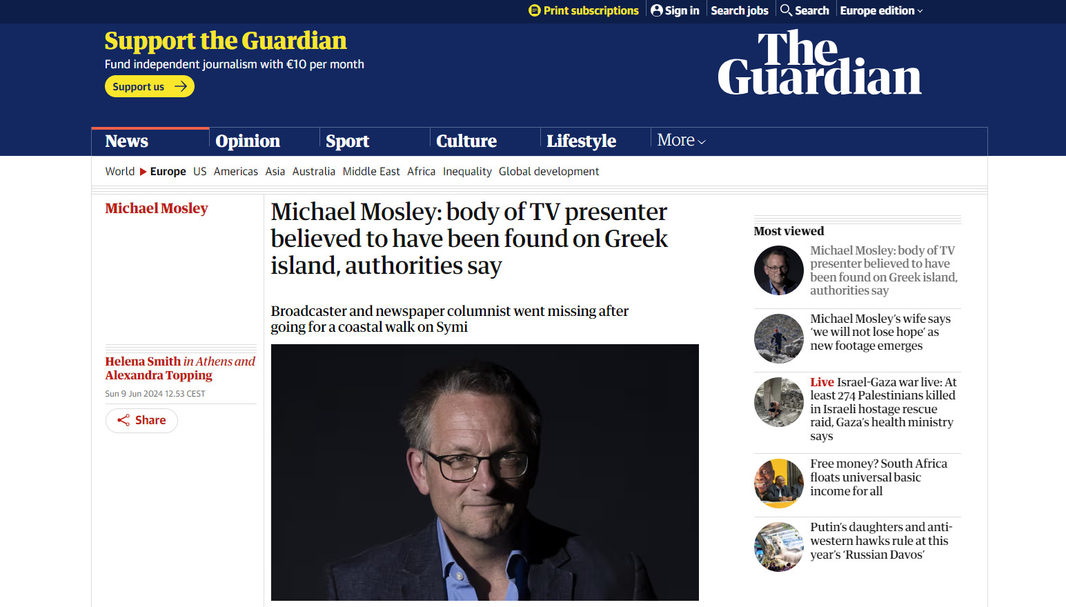 «Μάικλ Μόσλεϊ: Η σορός του τηλεοπτικού παρουσιαστή πιστεύεται ότι βρέθηκε σε ελληνικό νησί, λένε οι Αρχές», αναφέρει ο τίτλος του δημοσιεύματος του Guardian.