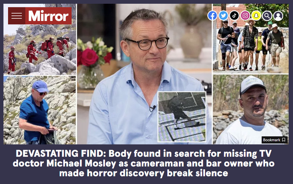 «Τραγικό εύρημα: Βρέθηκε πτώμα στην αναζήτηση του αγνοούμενου τηλεοπτικού γιατρού Μάικλ Μόσλεϊ, καθώς ο εικονολήπτης και ο ιδιοκτήτης του μπαρ που έκανε την ανακάλυψη φρίκης σπάει τη σιωπή του», είναι ο τίτλος του πρωτοσέλιδου της Mirror.