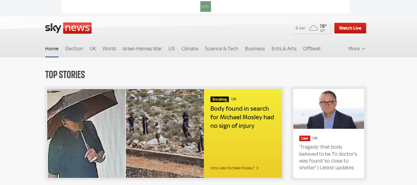 Το Sky News έχει δύο θέματα στην πρώτη του σελίδα για τον Μάικλ Μόσλεϊ. «Το πτώμα που βρέθηκε κατά την αναζήτηση του Μάικλ Μόσλεϊ δεν είχε σημάδια τραυματισμού», αναφέρει ο τίτλος του κεντρικού άρθρου του βρετανικού δικτύου.