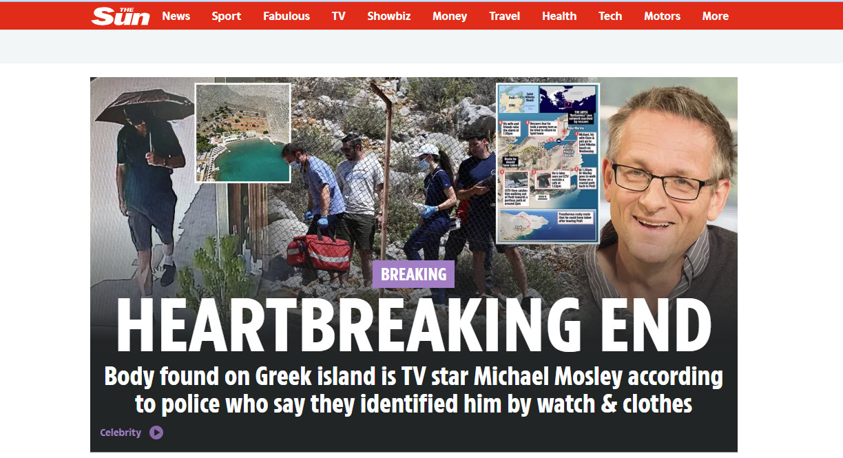 «Σπαρακτικό φινάλε: Το πτώμα που βρέθηκε σε ελληνικό νησί είναι ο τηλεοπτικός σταρ Μάικλ Μόσλεϊ σύμφωνα με την αστυνομία που λέει ότι τον αναγνώρισε από το ρολόι και τα ρούχα του», γράφει το πρωτοσέλιδο της The Sun.