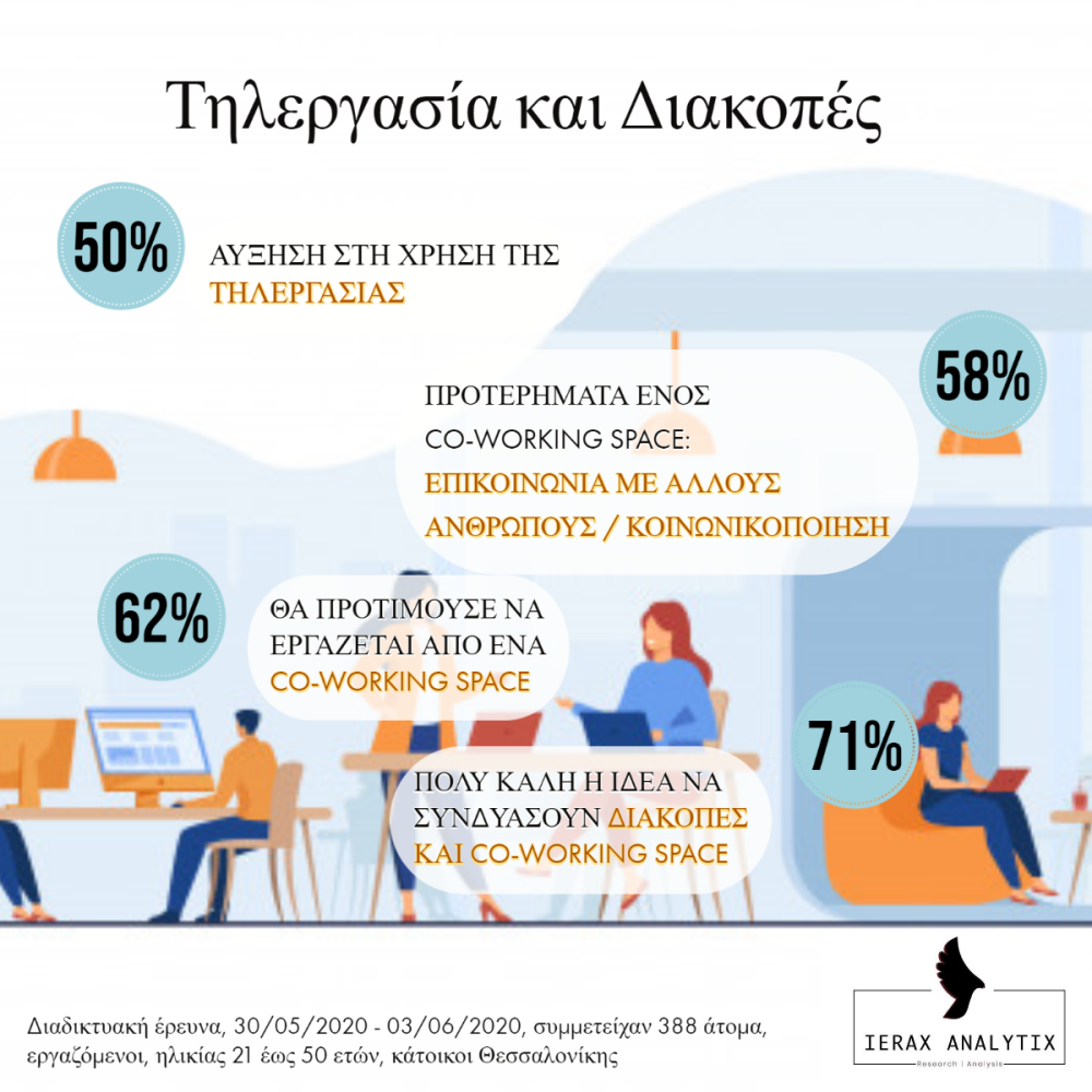 Στο νέο της ερευνητικό έργο η ierax analytix σε συνεργασία με το coho co-working space, διενήργησε μια έρευνα σε 388 εργαζόμενους στη Θεσσαλονίκη, 21-50 ετών, για να εξετάσει πως τους έχει επηρεάσει το θέμα της τηλεργασίας σε συνδυασμό με τις διακοπές τους το φετινό καλοκαίρι.