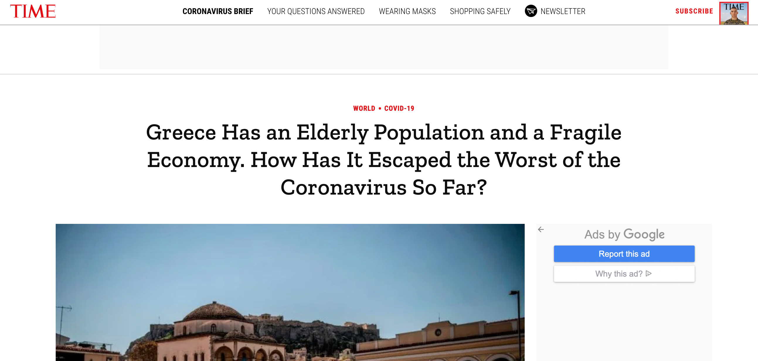 Mε εκτενές του άρθρο το περιοδικό TIME, τονίζει ότι το βασικό σημείο της ελληνικής επιτυχίας ήταν τα πρώτα βήματα στα οποία προέβη η ελληνική κυβέρνηση για να περιορίσει την εξάπλωση του ιού, πιο πριν από το μεγαλύτερο μέρος της Ευρώπης