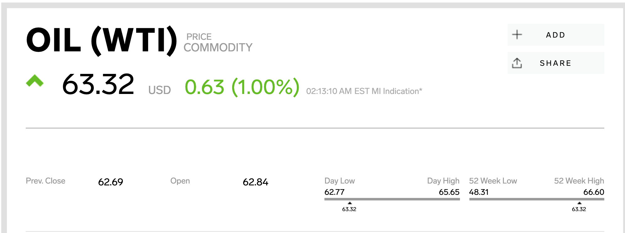 Με πάνω από 63 δολάρια το βαρέλι να κινείται αυτή την ώρα η τιμή του πετρελαίου στις αγορές απαντά νευρικά η αγορά στο χτύπημα του Ιράν στην αμερικάνικη βάση των ΗΠΑ στο Ιράκ.