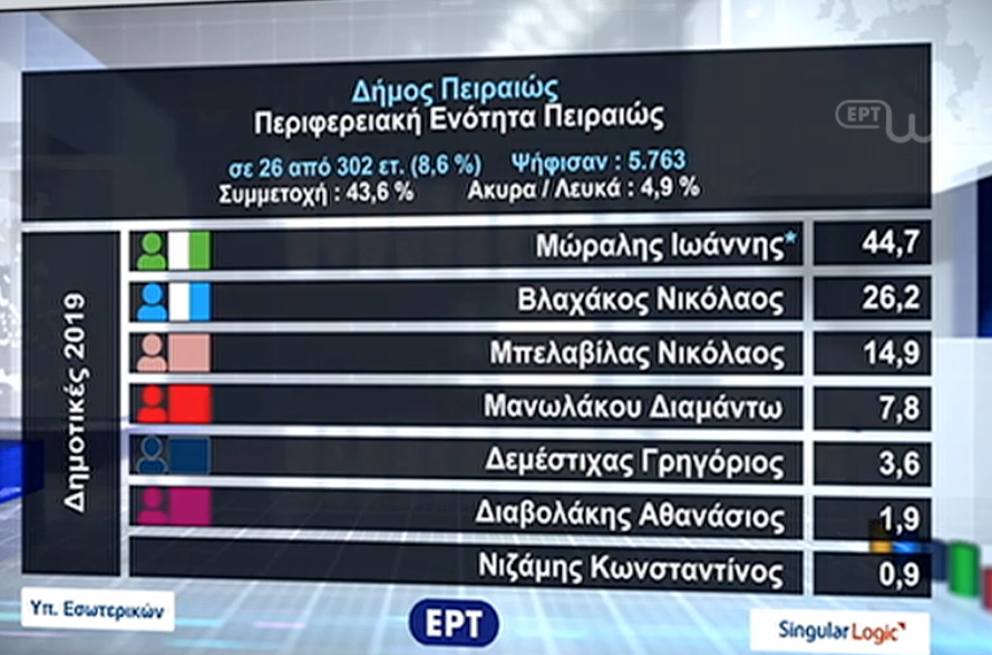 Μώραλης και Βλαχάκος περνούν στον δεύτερο γύρο των δημοτικών εκλογών στον Πειραιά.