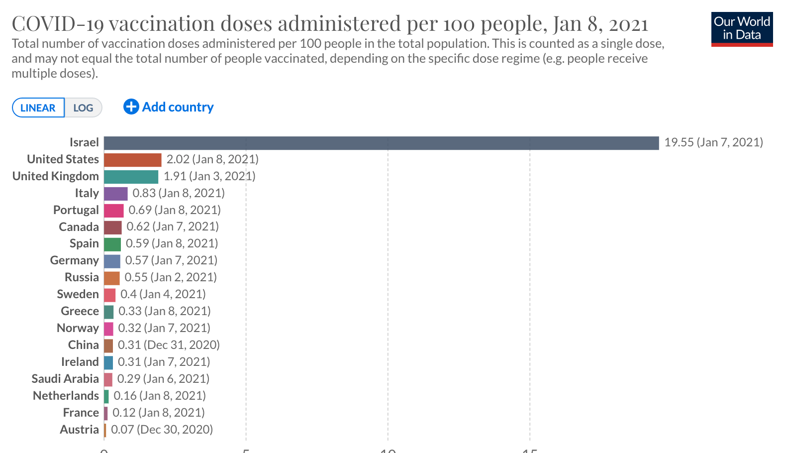 1. Το εμβόλιο είναι εμπόρευμα. Όποια χώρα το πληρώνει ακριβότερα παίρνει περισσότερες δόσεις (Ισραήλ). Όποια χώρα το παράγει δεσμεύει περισσότερες δόσεις (ΗΠΑ, Γερμανία, Ρωσία). Όποια χώρα έχει καλύτερες σχέσεις με τον παραγωγό παίρνει περισσότερες δόσεις (UK, Καναδάς) Όποια χώρα ποντάρει στην δική της παραγωγή δεν συμμετέχει ενεργά στο παζάρι των υπαρχόντων εμβολίων (Γαλλία, UK)