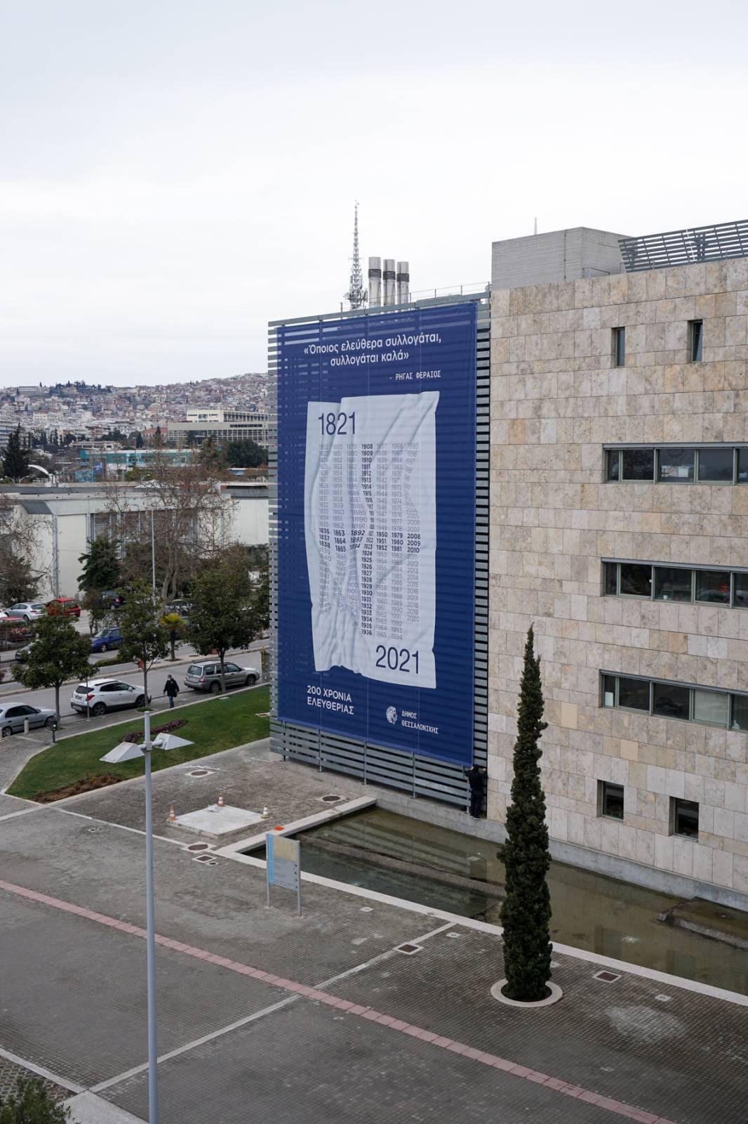 Ένα τεράστιο πανό με αναφορά στα 200 χρόνια από την Ελληνική Επανάσταση αναρτήθηκε σήμερα, παρουσία του Δημάρχου Θεσσαλονίκης Κωνσταντίνου Ζέρβα, στην πρόσοψη του Δημαρχείου Θεσσαλονίκης.
