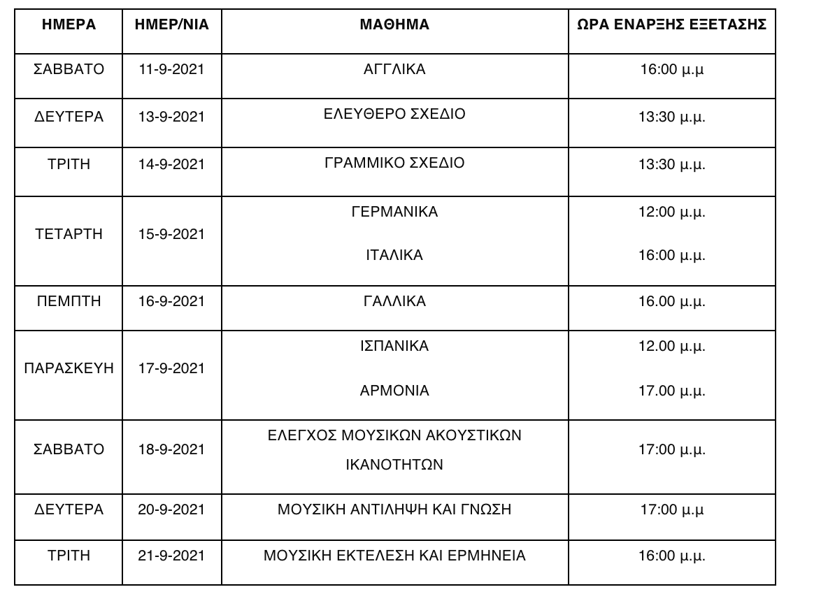 – των ξένων γλωσσών και της Αρμονίας είναι τρεις (3) ώρες, – των Σχεδίων ( Ελεύθερο και Γραμμικό) είναι έξι (6) ώρες, – του ειδικού μαθήματος «Έλεγχος Μουσικών Ακουστικών Ικανοτήτων» είναι περίπου είκοσι (20) λεπτά. – για το μουσικό μάθημα «Μουσική Εκτέλεση και Ερμηνεία» η εξέταση της φωνητικής ή οργανικής μουσικής διαρκεί 2΄ με 6΄ λεπτά για κάθε υποψήφιο. – για το μουσικό μάθημα «Μουσική Αντίληψη και Γνώση», η εξέταση στο αντικείμενο της Μουσικής Αντίληψης έχει διάρκεια 30’ λεπτών, ενώ η εξέταση στο αντικείμενο της Μουσικής Γνώσης έχει διάρκεια 2 ωρών.
