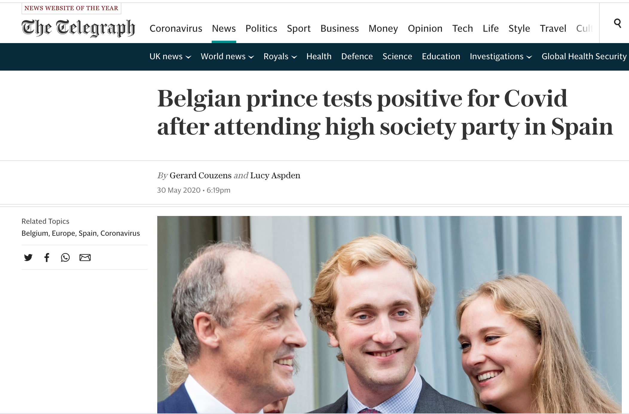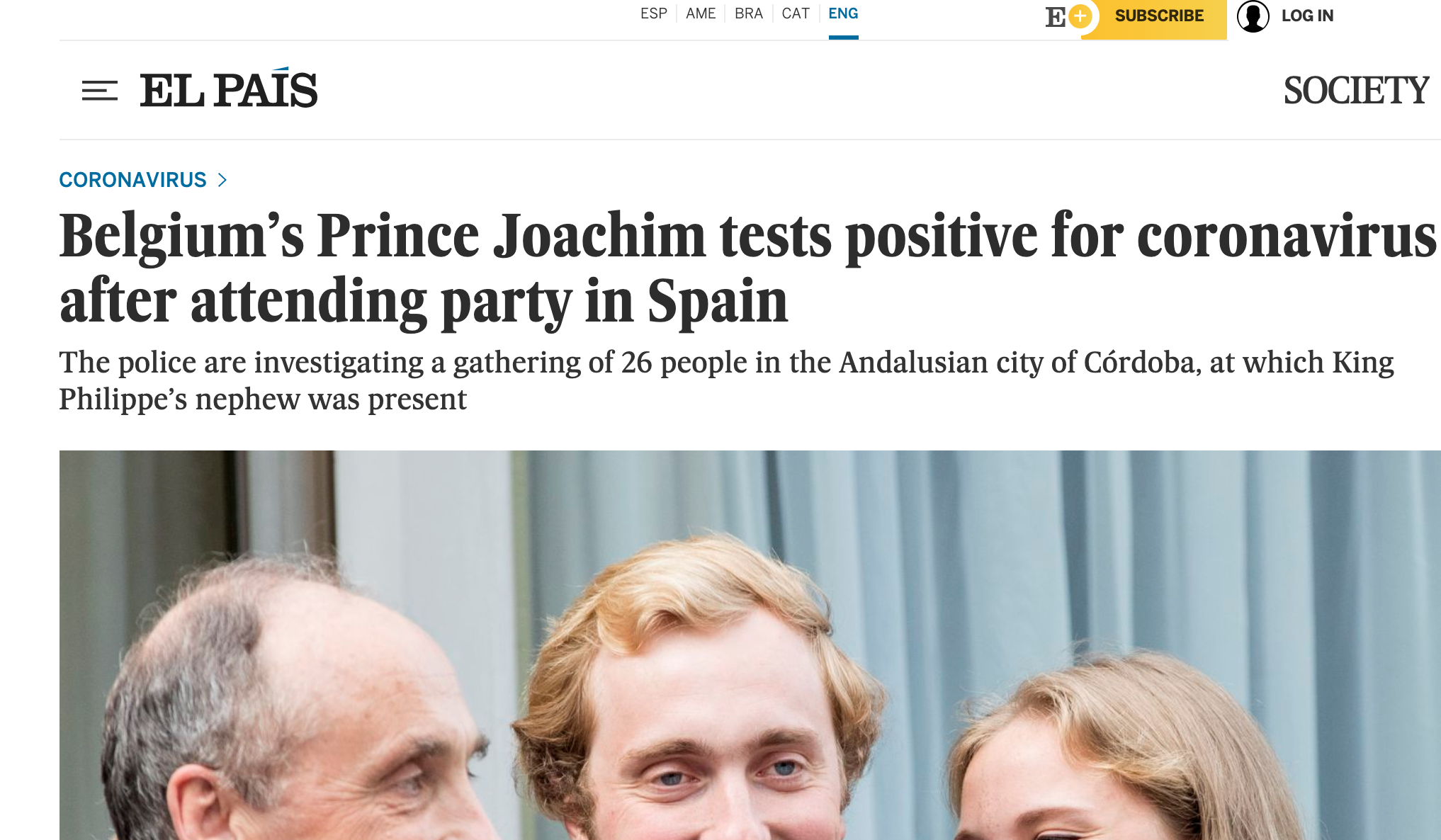Σε μια πρωτοφανή αποκάλυψη προβαίνουν το BBC, η Telegraph και ισπανικά ΜΜΕ. Συγκεκριμένα πριν από 5 μέρες, στις 26/5, εν μέσω καραντίνας και απαγορεύσεων ταξιδιών προς την Ισπανία, ο πρίγκιπας του Βελγίου Joachim, ταξίδεψε σύμφωνα πλέον και με την επίσημη ανακοίνωση του παλατιού στην Ισπανία και παραβρέθηκε σε πάρτι στην Cordoba μαζί με 28 ακόμη άτομα.