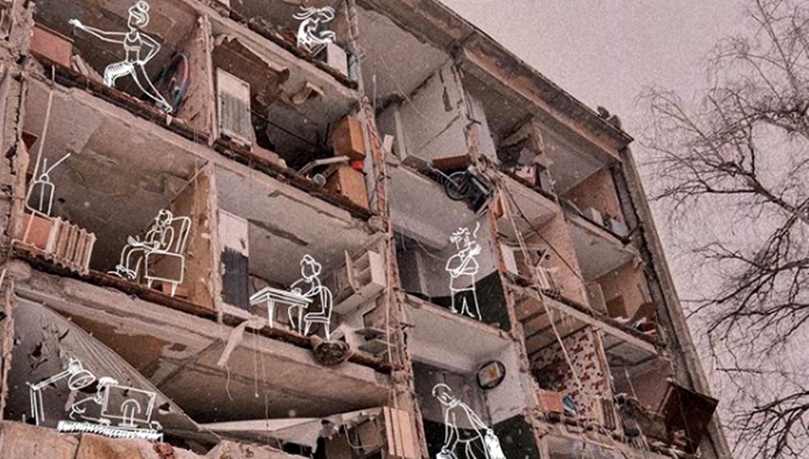 Με αυτό το συγκλονιστικό κείμενο και με μία συγκινητική φωτογραφία που σχεδίασε πάνω της η ίδια, βάζοντας σκίτσα ανθρώπων να συνεχίζουν τη ζωή τους στα χαλάσματα μίας οικοδομής, όπως ίσως να κάνανε αν δεν υπήρχε ο πόλεμος, η graphic designer Sasha Anisimova από το Χάρκοβο, στέλνει το δικό της μήνυμα από την πληγωμένη Ουκρανία, με ανάρτηση της.