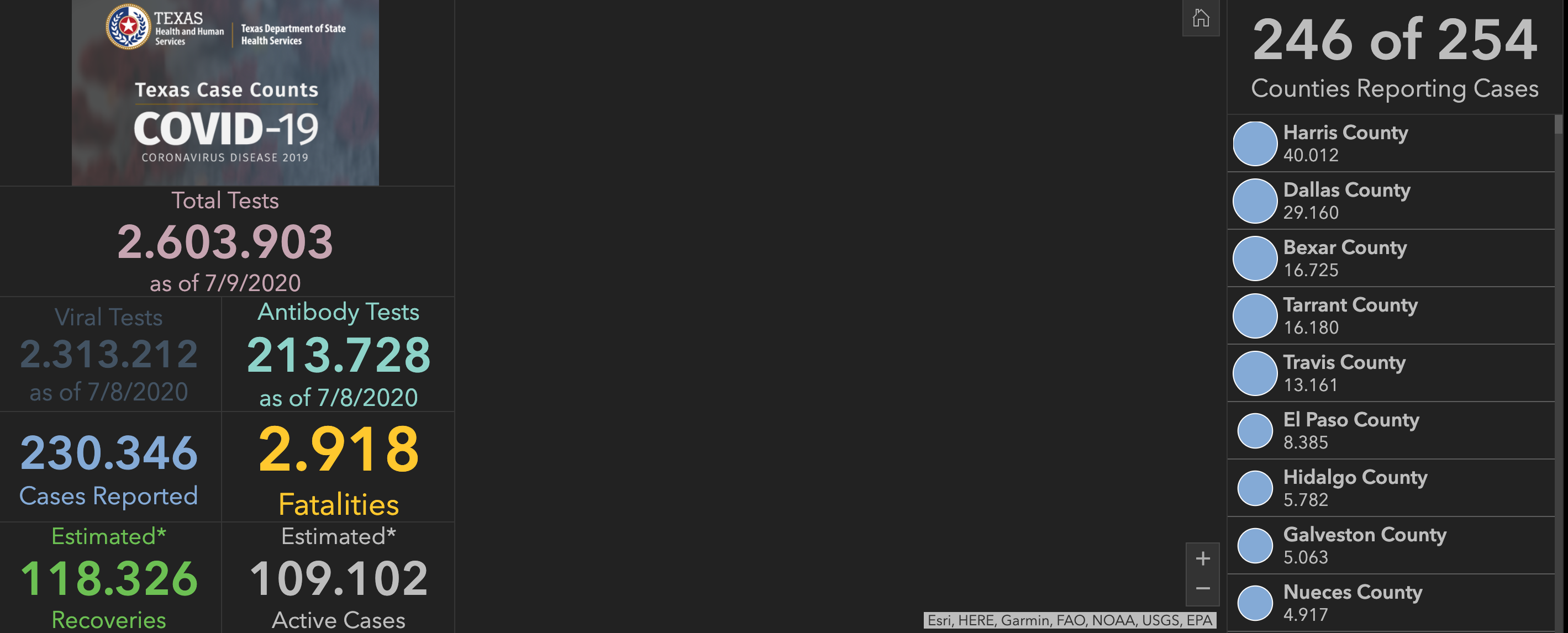 Το Τέξας, ενώ βρισκόταν σε εξαιρετικά επιδημιολογικά επίπεδα δέχτηκε σοβαρές πιέσεις να ανοίξει την βιομηχανία του με αποτέλεσμα την έκρηξη μολύνσεων