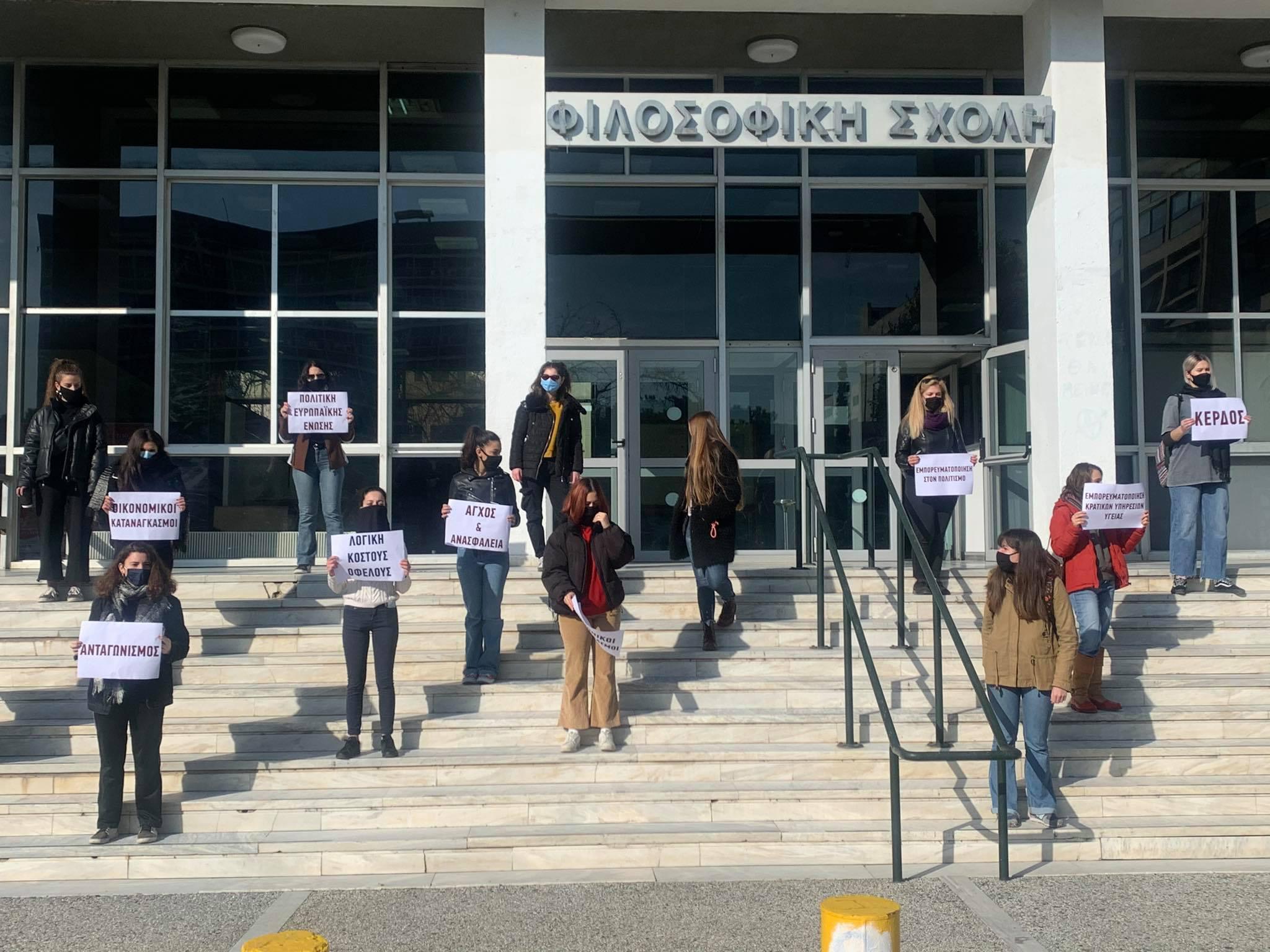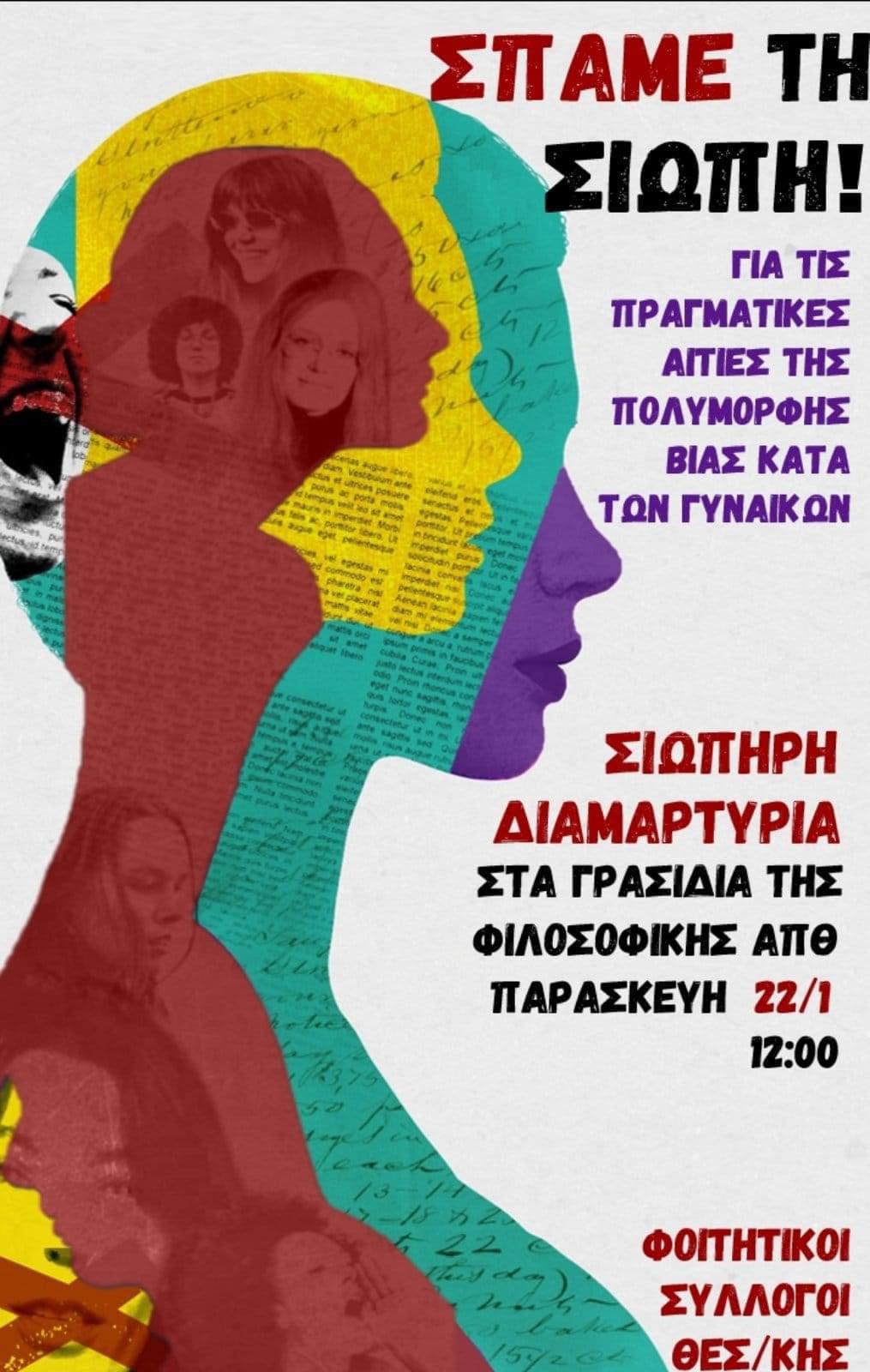 Συμβολική συγκέντρωση διαμαρτυρίας πραγματοποιείται αυτή την ώρα στα γρασίδια της Φιλοσοφικής του Απθ, πικετοφορία με αποστάσεις, και κεντρικό σύνθημα «ΣΠΑΜΕ ΤΗ ΣΙΩΠΗ για τις πραγματικές αιτίες της πολύμορφης βίας κατά των γυναικών! ΠΟΛΛΑ ΣΤΟΜΑΤΑ, ΜΙΑ ΦΩΝΗ» από Φοιτητικούς Συλλόγους Θεσσαλονίκης. Aυτή τη στιγμή, οι φοιτητές παρουσίαζουν ένα δρώμενο.