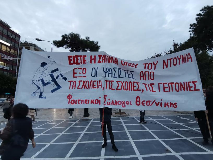 Το συλλαλητήριο έχει σαφώς και αντιφασιστικό χαρακτήρα. Στη συγκέντρωση συμμετέχουν και φοιτητικοί σύλλογοι και μαθητές που αναδεικνύουν με δικό τους πανό τα τραγικά γεγονότα που έλαβαν χώρα τις τελευταίες ημέρες στα 1ο και 2ο ΕΠΑΛ Σταυρούπολης.