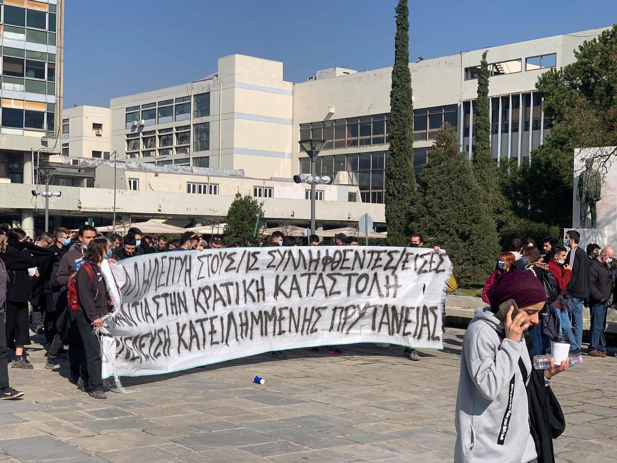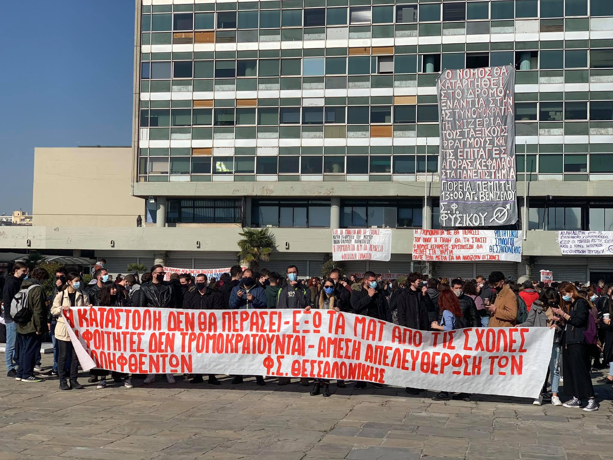 Μετά τις χθεσινές εικόνες της εφόδου της ΕΛ.ΑΣ στο Αριστοτέλειο Πανεπιστήμιο Θεσσαλονίκης και τις συλλήψεις φοιτητών και φοιτητριών οι συμμετέχοντες προχώρησαν σε νέα κινητοποίηση καταγγέλλοντας την πρυτανεία Παπαϊωάννου, ζητώντας παράλληλα την απελευθέρωση των συλληφθέντων.
