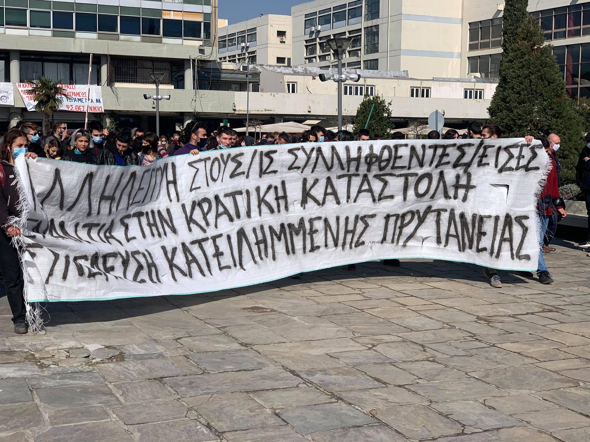 Φοιτητές πραγματοποιούν πορεία από την Πρυτανεία προς τα Δικαστήρια Θεσσαλονίκης διαμαρτυρόμενοι για τις συλλήψεις και τη χρήση αστυνομικής βίας έξω από το ΑΠΘ την Δευτέρα.