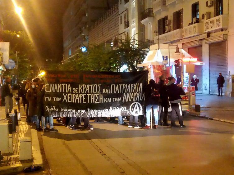 Ένα κομμάτι της πορείας αποτελούμενο απο άτομα του αναρχικού χώρους αποσπάστηκε απο το κεντρικό μπλοκ και μέσω της Ερμού κινήθηκε προς Α.Τ. που βρίσκεται επο της Αριστοτέλους όπου πραγματοποίησε ολιγόλεπτη στάση φωνάζοντας συνθήματα κατά της πατριαρχίας και της κρατικής εξουσίας.