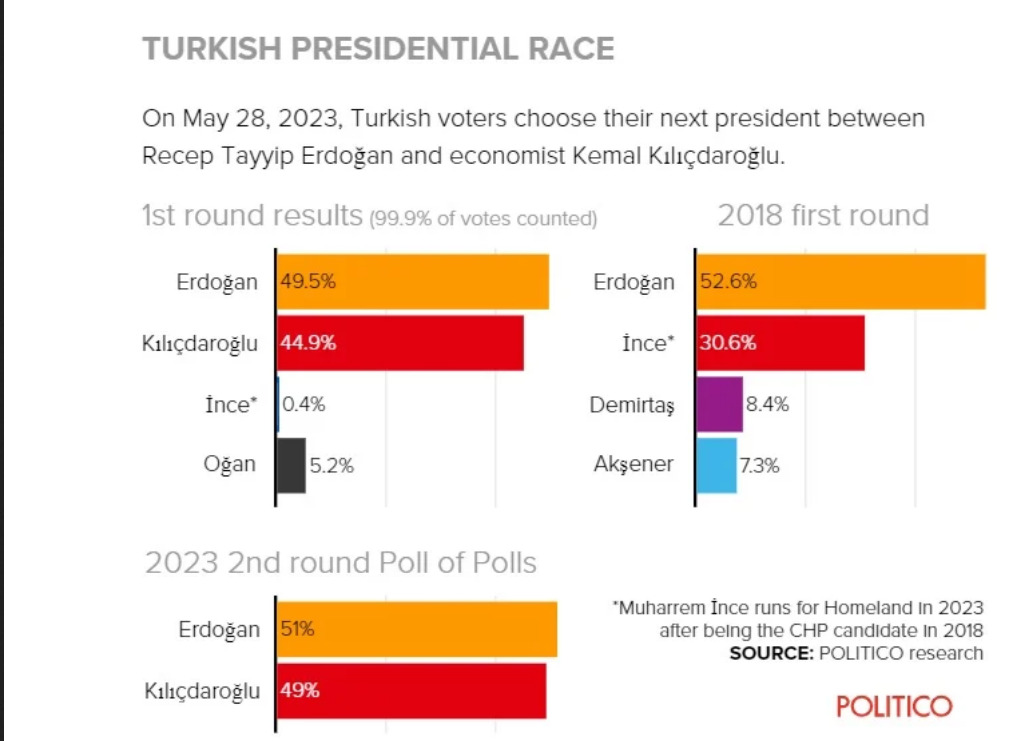 Σημειώνεται πως και το Politico δίνει νικητή τον Ερντογάν στο δεύτερο γύρο των εκλογών στην Τουρκία.