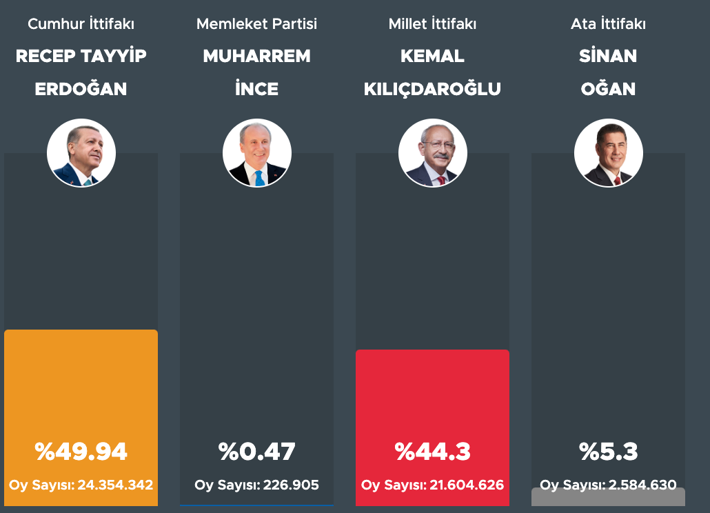Σύμφωνα με το CHP, κανένας υποψήφιος δεν έχει κερδίσει περισσότερο από το 50% των ψήφων και ο Κιλιτσντάρογλου προηγείται επί του παρόντος με διαφορά 1%.
