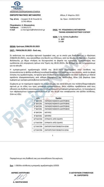 «Σε απάντηση του ανωτέρω σχετικού έγγραφού σας, με το οποίο μας διαβιβάστηκε η ‘Ερώτηση 2506/03.03.2023′, που κατατέθηκε στη Βουλή των Ελλήνων, από τον Βουλευτή Λάρισας κ. Κυριάκο Βελόπουλο, με θέμα Ανάγκη να διευκρινιστεί το φορτίο της εμπορικής αμαξοστοιχίας που εμπλέκεται στη σύγκρουση τρένων στα Τέμπη της 28.02.2023’, θα θέλαμε να σας ενημερώσουμε για τα κάτωθι: