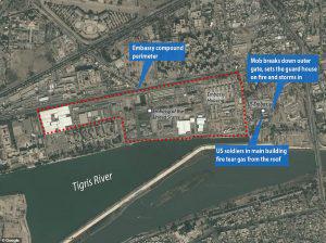 Η μία από τις ρουκέτες έπεσε στην καφετέρια της αμερικανικής διπλωματικής αποστολής. Είναι η πρώτη φορά που ρουκέτες πλήττουν την αμερικανική πρεσβεία, η οποία βρίσκεται στην Πράσινη Ζώνη, όπου έχουν την έδρα τους πολλές διπλωματικές αποστολές και κυβερνητικές υπηρεσίες. Πληροφορίες μιλούν για πέντε τραυματίες μέσα στην πρεσβεία, κάποιοι από αυτούς σοβαρά. Ελικόπτερο προσγειώθηκε πριν λίγο μέσα στην πρεσβεία για να μεταφέρει τους τραυματίες στο Κουβέιτ. Νέες πληροφορίες μιλούν για 2 νεκρούς. Η Αμερικάνικη κυβέρνηση διαψεύδει τις πληροφορίες.