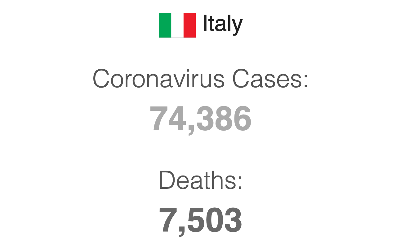 7.503 νεκροί στην Ιταλία Ο συνολικός αριθμός των περιστατικών κορονοϊού στην Ιταλία είναι 74.386. Οι νεκροί έφτασαν τους 7.503. Παράλληλα, 9.362 άνθρωποι έχουν ιαθεί.