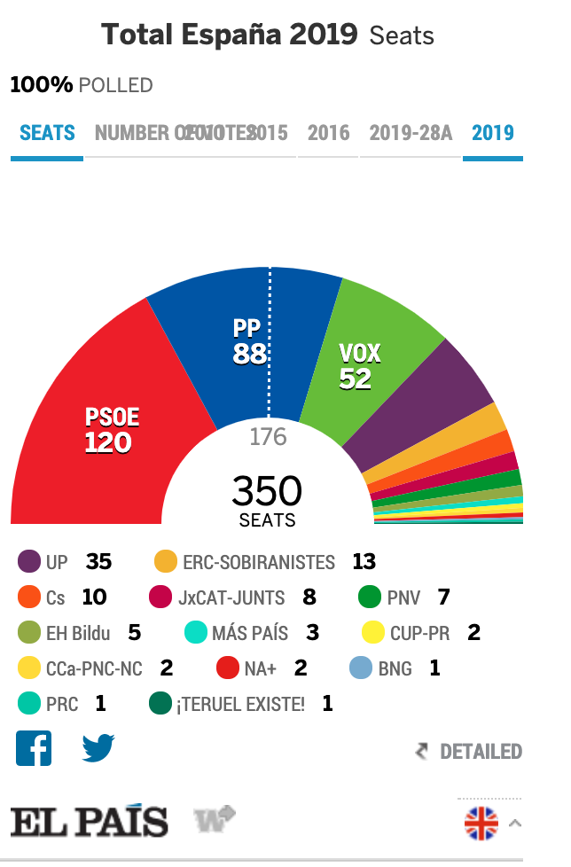 Τους ακολουθεί το συντηρητικό Λαϊκό Κόμμα με 88 έδρες. Οι Ciudadanos συγκεντρώνουν 10 έδρες και οι Unidas Podemos 26 έδρες.